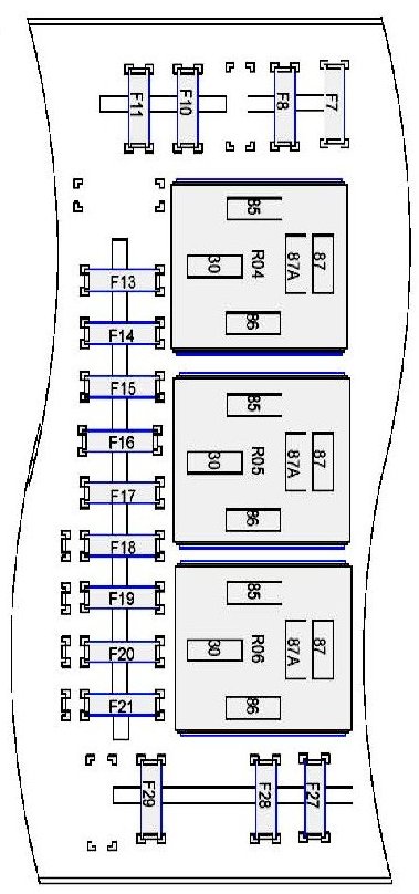 Fuse/Locations and Relay/Locations contains a view of the fuse/relay box, in which fuses and relays are identified, numbered and named. Fuse and relay numbering and naming follow the indication of the fuse panel cover. In addition, for all removable relays, pin positions are added to illustrate proper orientation.