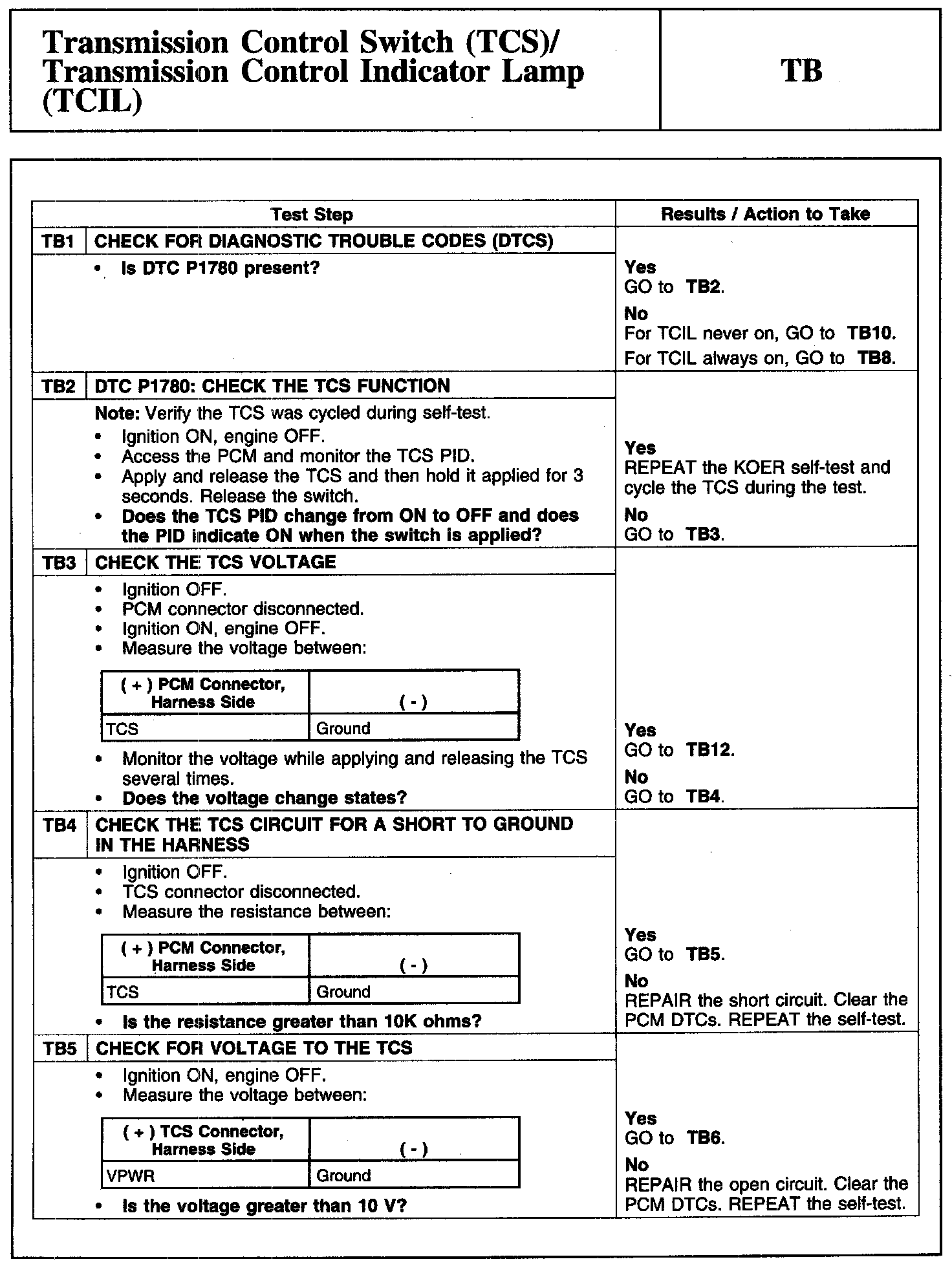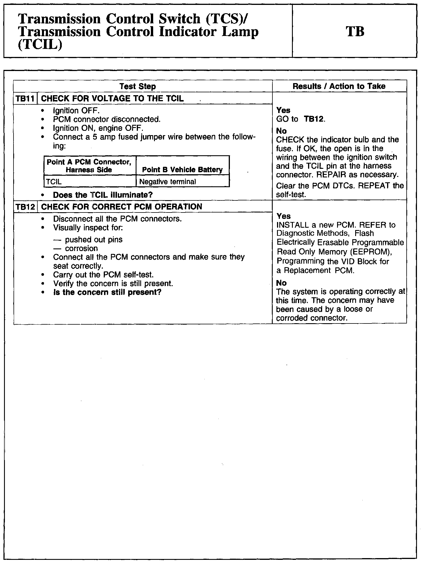 PINPOINT TEST TB: TRANSMISSION CONTROL SWITCH (TCS)/TRANSMISSION CONTROL INDICATOR LAMP (TCIL)