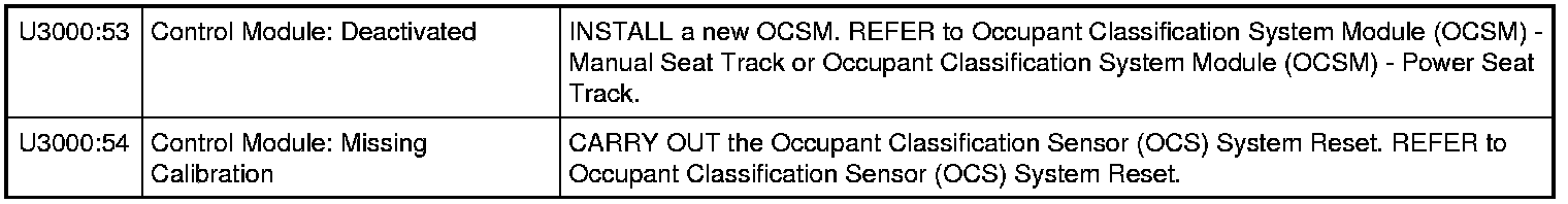 Home >> Ford >> 2010 >> Edge AWD V6-3.5L >> Repair and Diagnosis >> Restraints and Safety Systems >> Air Bag Systems >> Testing and Inspection >> Diagnostic Trouble Code Tests and Associated Procedures >> Occupant Classification System Module (OCSM) DTC Chart