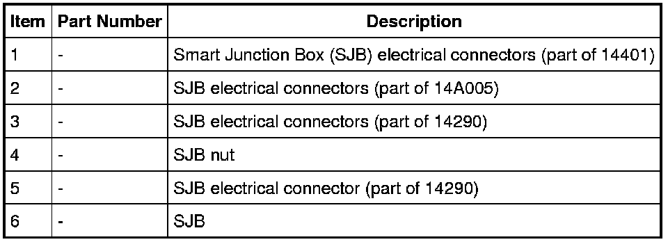 NOTE: The steps included in the SJB removal and installation procedure are critical to restoring the vehicle security and TPMS to normal operation. A new SJB is delivered in a manufacturing mode with 8 pre-set DTCs related to the TPMS. To clear the 8 DTCs, successful configuration of the SJB must occur, followed by successful TPMS sensor training, and a successful self-test, including clearing of the DTCs. The 8 DTCs are as follows: