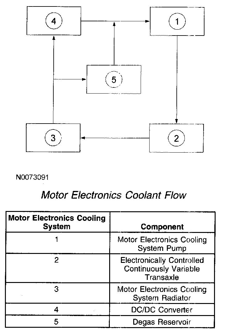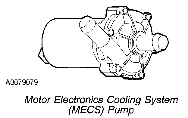 The motor electronics cooling system is required to maintain an acceptable temperature for the transaxle and the DC/DC converter. The system temperature is monitored by the motor electronics coolant temperature (MECT) sensor, which is an input to the PCM. The PCM commands the MECS pump using the MECS pump relay. The MECS pump is commanded on whenever the traction battery contactors are closed. The coolant in the system flows in a loop from the MECS pump, to the transaxle, then into the MECS radiator bottom hose port, out of the top hose port of the MECS radiator, into the DC/DC converter, and back into the MECS pump. The cooling system has a degassing system that is connected in parallel between the MECS radiator and the MECS pump. The degassing system bleeds air/gases into the degas reservoir.