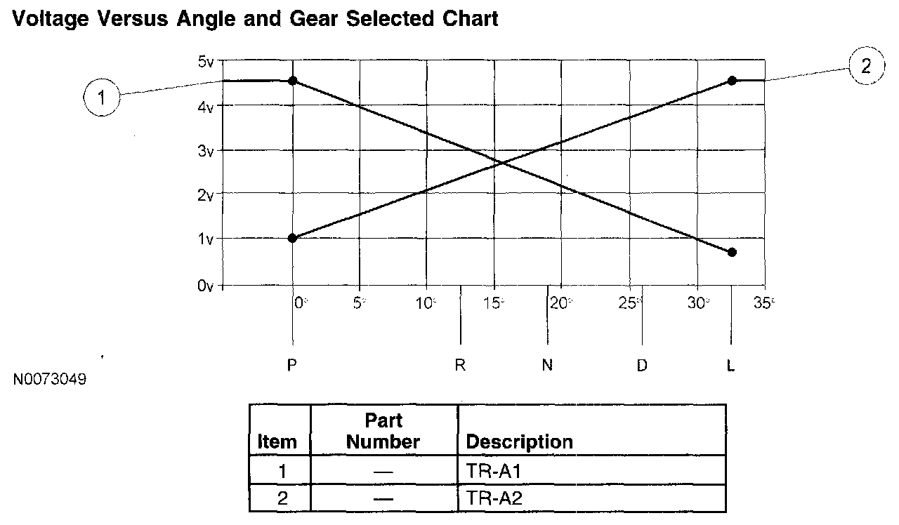 The TR-A1 signal has a negative voltage slope, meaning the voltage decreases when the sensor angle increases. The typical TR voltage ranges from approximately 4.3 volts in the PARK position to approximately 0.6 volt in the LOW gear position. The TR-A2 signal has a positive voltage slope. Voltages increase as the sensor angle increases. The typical voltage for the TR-A2 is about 1 volt in the PARK position to about 4.4 volts in the LOW gear position.