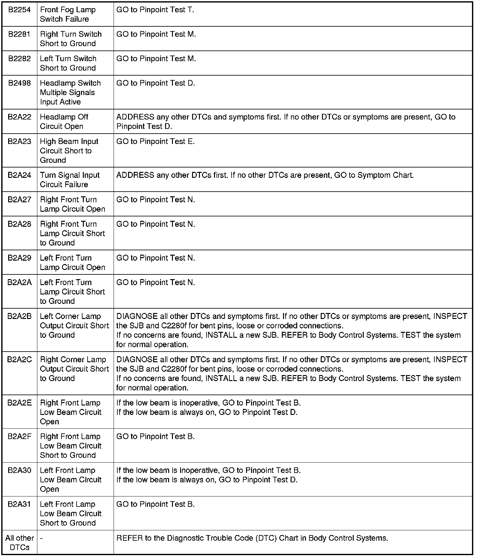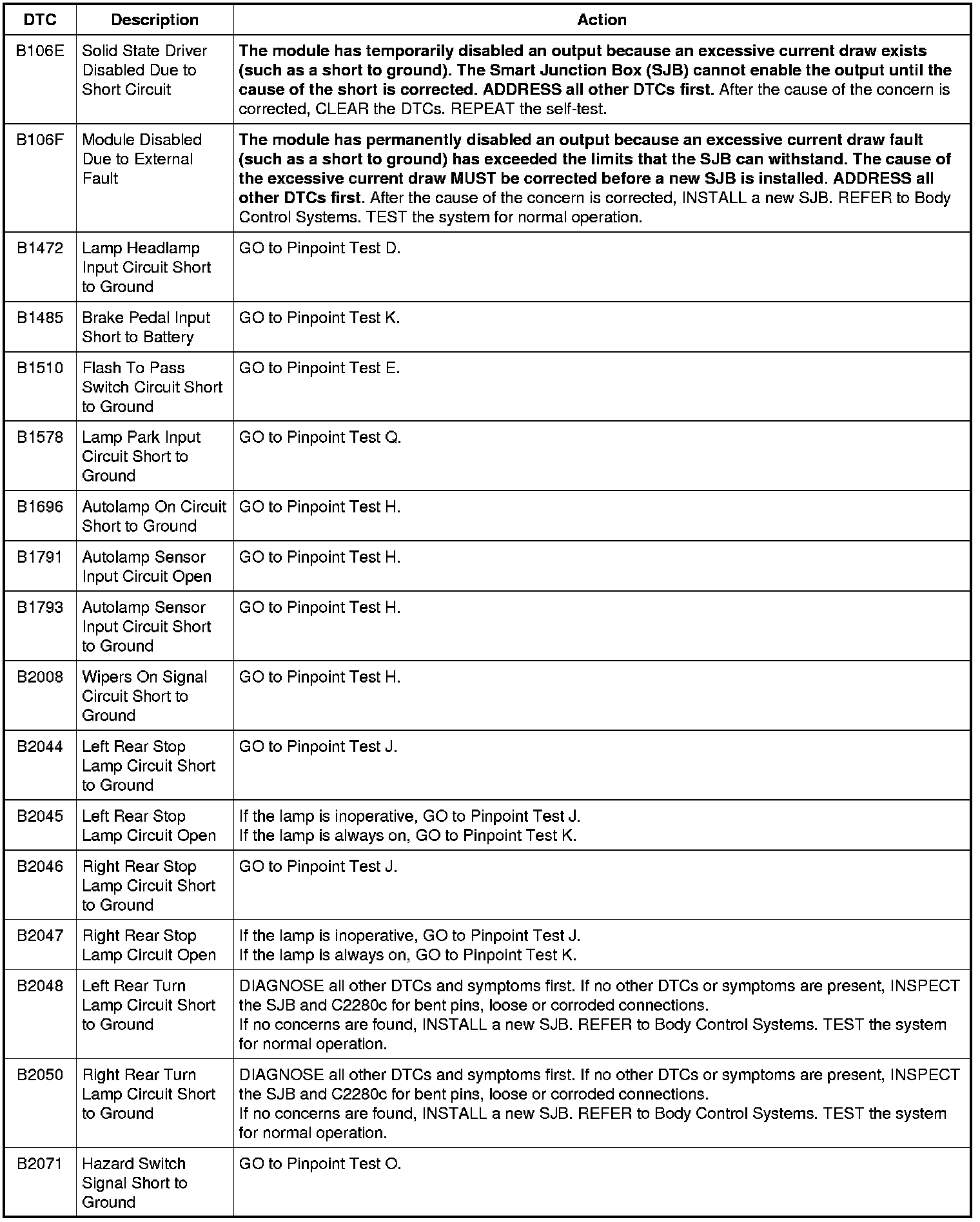 Smart Junction Box (SJB) DTC Chart