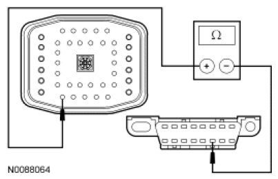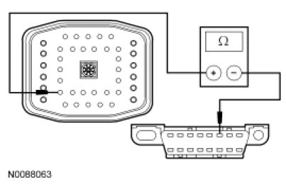 - Measure the resistance between the BCM C4227a-29, circuit VDB04 (WH/BU), harness side and the DLC C251-6, circuit VDB04 (WH/BU), harness side.