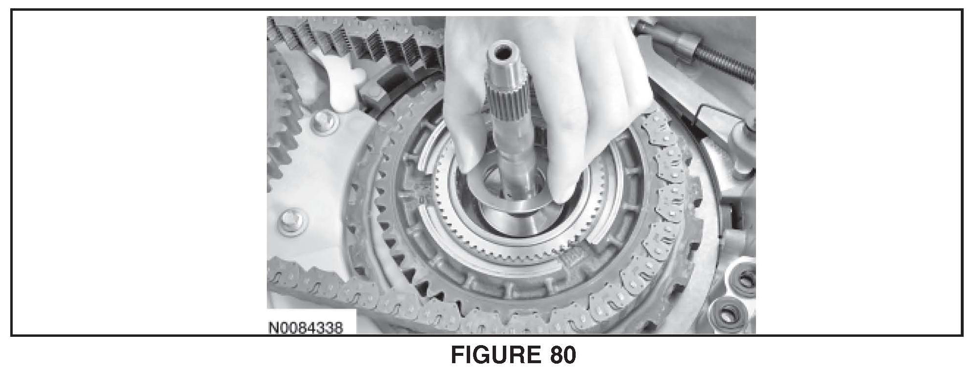 43. Apply 483 kPa (70 psi) of air pressure to the forward (1, 2, 3, 4) clutch piston port while recording the clutch pack clearance on the dial indicator. The clearance should be between 0.076 mm (0.002 in) and 1.840 mm (0.072 in). If the clearance is out of range, check the forward (1, 2, 3, 4) clutch pack for correct installation and the transaxle for correct assembly. See Figure 76.