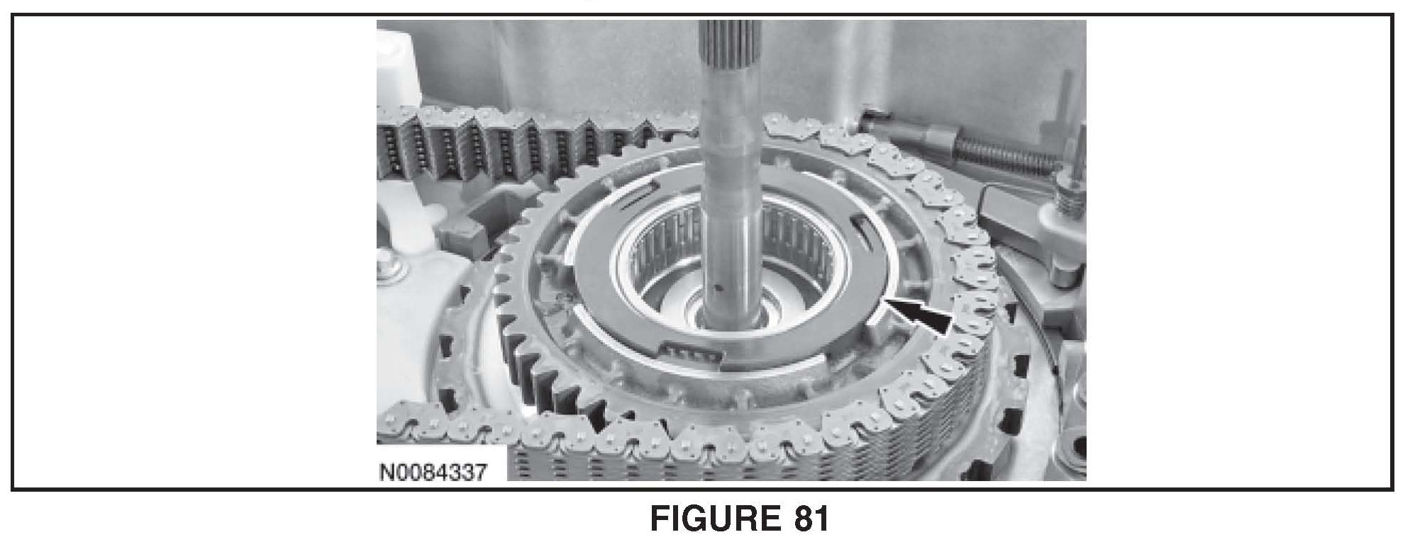 Install the forward (1, 2, 3, 4) clutch beveled snap ring with the flat side down with the gap facing the front of the transaxle. See Figure 72.