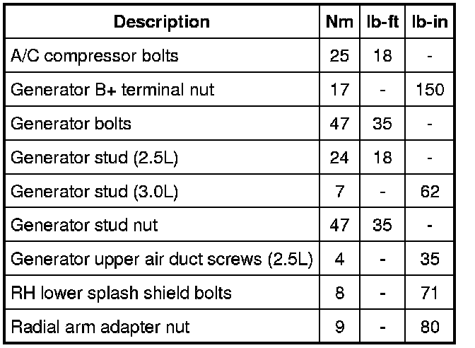 Home >> Ford >> 2010 >> Escape 2WD L4-2.5L >> Repair and Diagnosis >> Specifications >> Mechanical Specifications >> Charging System >> System Specifications >> Torque Specifications