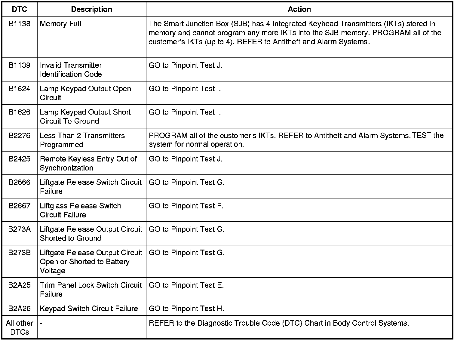 Smart Junction Box (SJB) DTC Chart