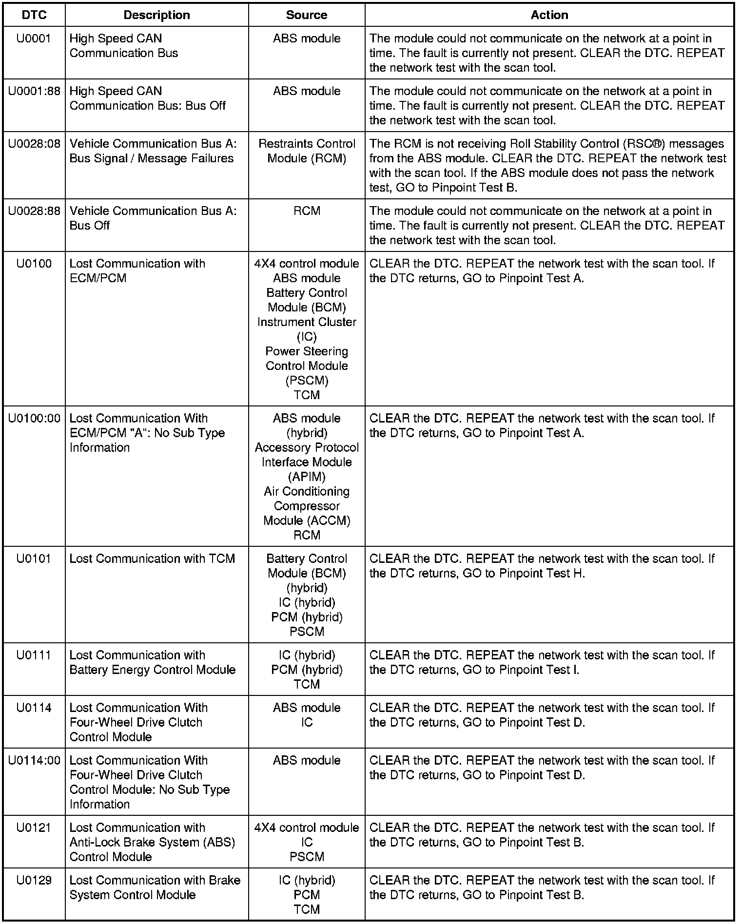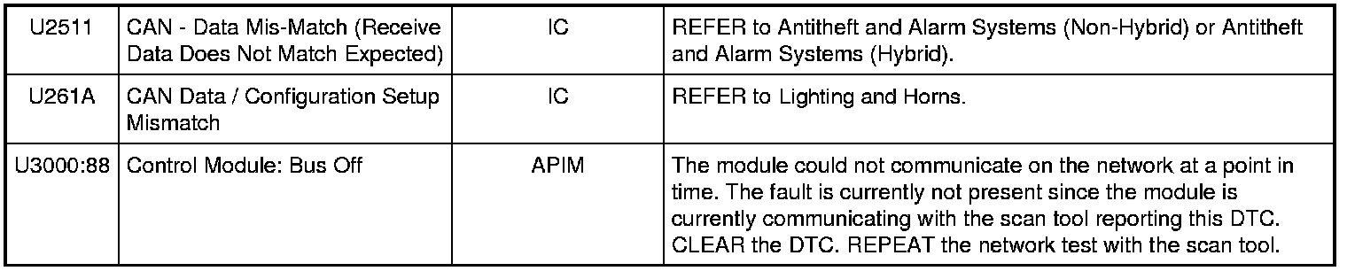 NOTE: Network DTCs (U-codes) are often a result of intermittent concerns such as damaged wiring or low battery voltage occurrences. Additionally, vehicle repair procedures such as module reprogramming often set network DTCs. Replacing a module to resolve a network DTC is unlikely to resolve the concern. To prevent repeat network DTC concerns, inspect all network wiring, especially connectors. Test the vehicle battery, refer to Battery.