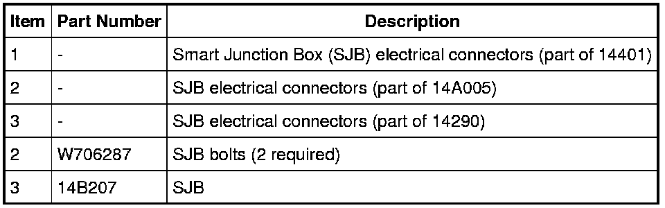 NOTE: Prior to the replacement of the module, it is necessary to upload the module configuration information to a scan tool. This information must be downloaded into the new Smart Junction Box (SJB) after installation. For additional information, refer to Information Bus. In the event that As-Built data entry is required (SJB will not communicate), all Remote Keyless Entry (RKE) devices must be programmed to the new SJB. A minimum of 2 devices are necessary to complete the configuration and turn off the flashing interior lights.