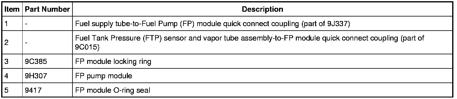 3. Disconnect the Fuel Tank Pressure (FTP) sensor and vapor tube assembly-to-FP module quick connect coupling and the supply fuel tube-to-FP module quick connect coupling. For additional information, refer to Fuel Delivery and Air Induction.