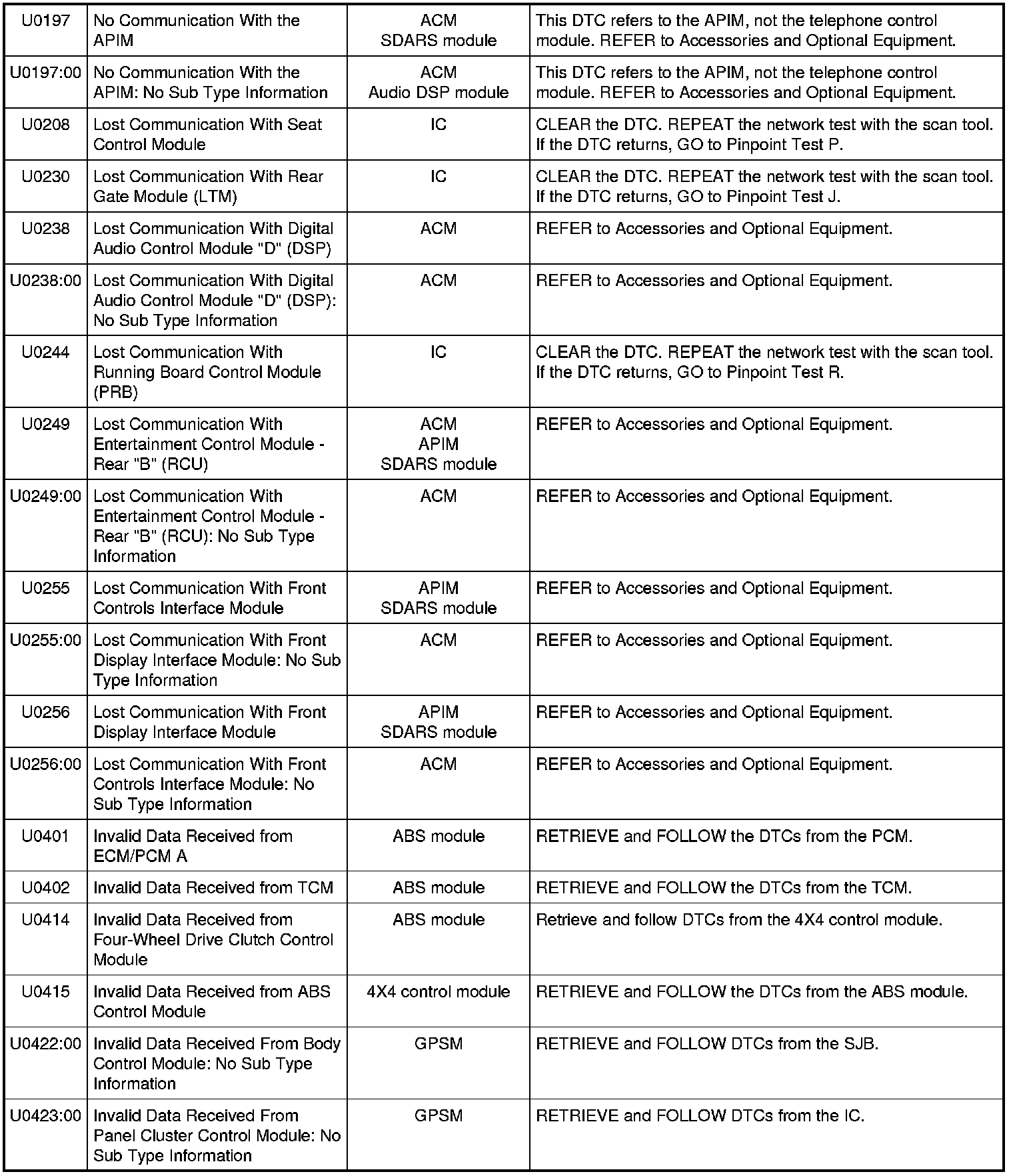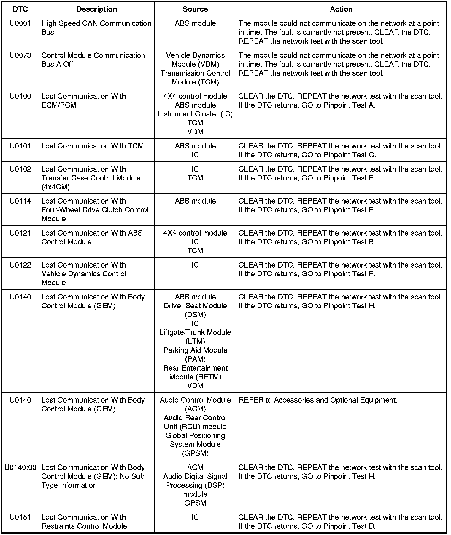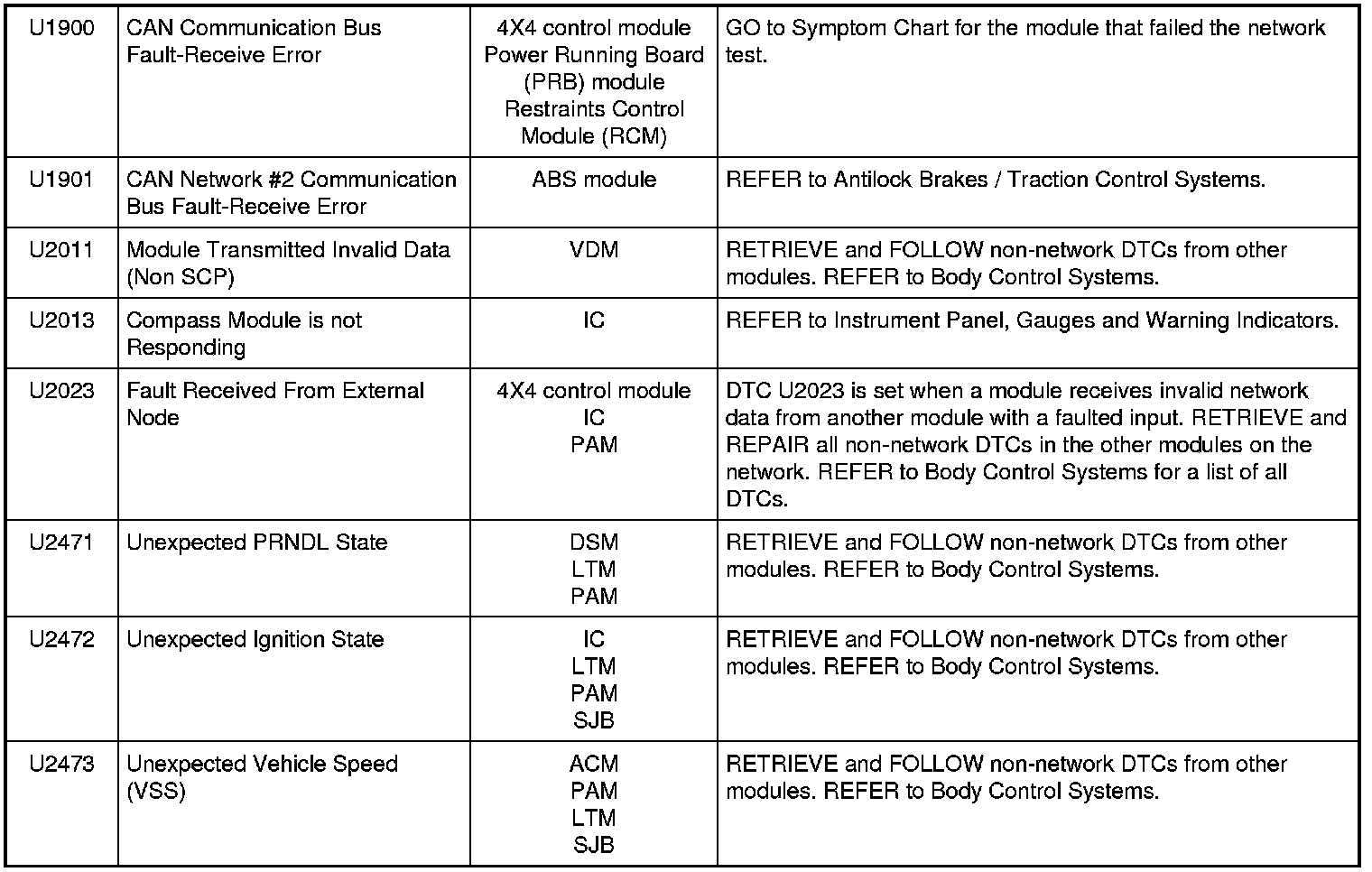 NOTE: Network DTCs (U-codes) are often a result of intermittent concerns such as damaged wiring or low battery voltage occurrences. Additionally, vehicle repair procedures such as module reprogramming often set network DTCs. Replacing a module to resolve a network DTC is unlikely to resolve the concern. To prevent repeat network DTC concerns, inspect all network wiring, especially connectors. Test the vehicle battery, refer to Battery.