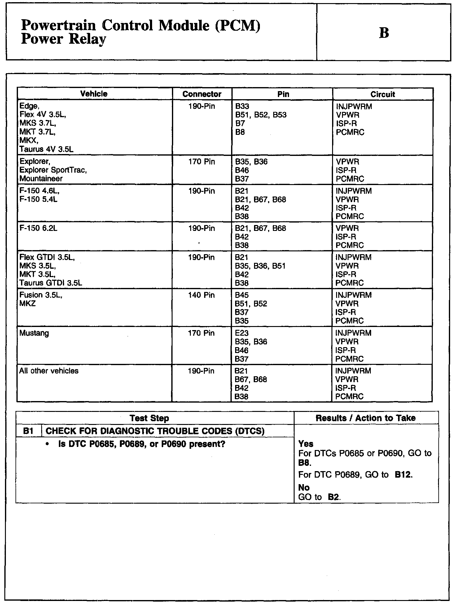 Home >> Ford >> 2010 >> Explorer AWD V6-4.0L >> Repair and Diagnosis >> Powertrain Management >> Computers and Control Systems >> Testing and Inspection >> Pinpoint Tests >> Test B: Powertrain Control Module (PCM) Power Relay