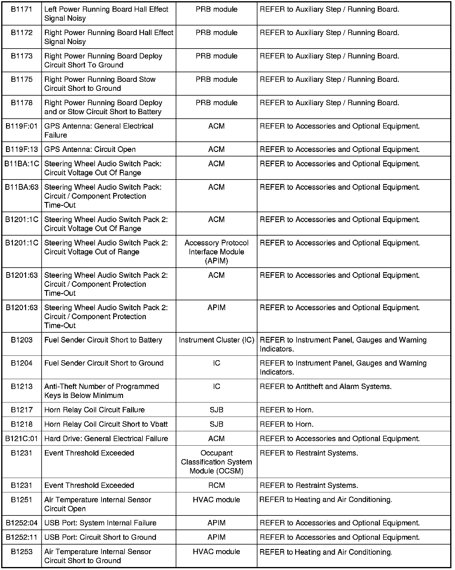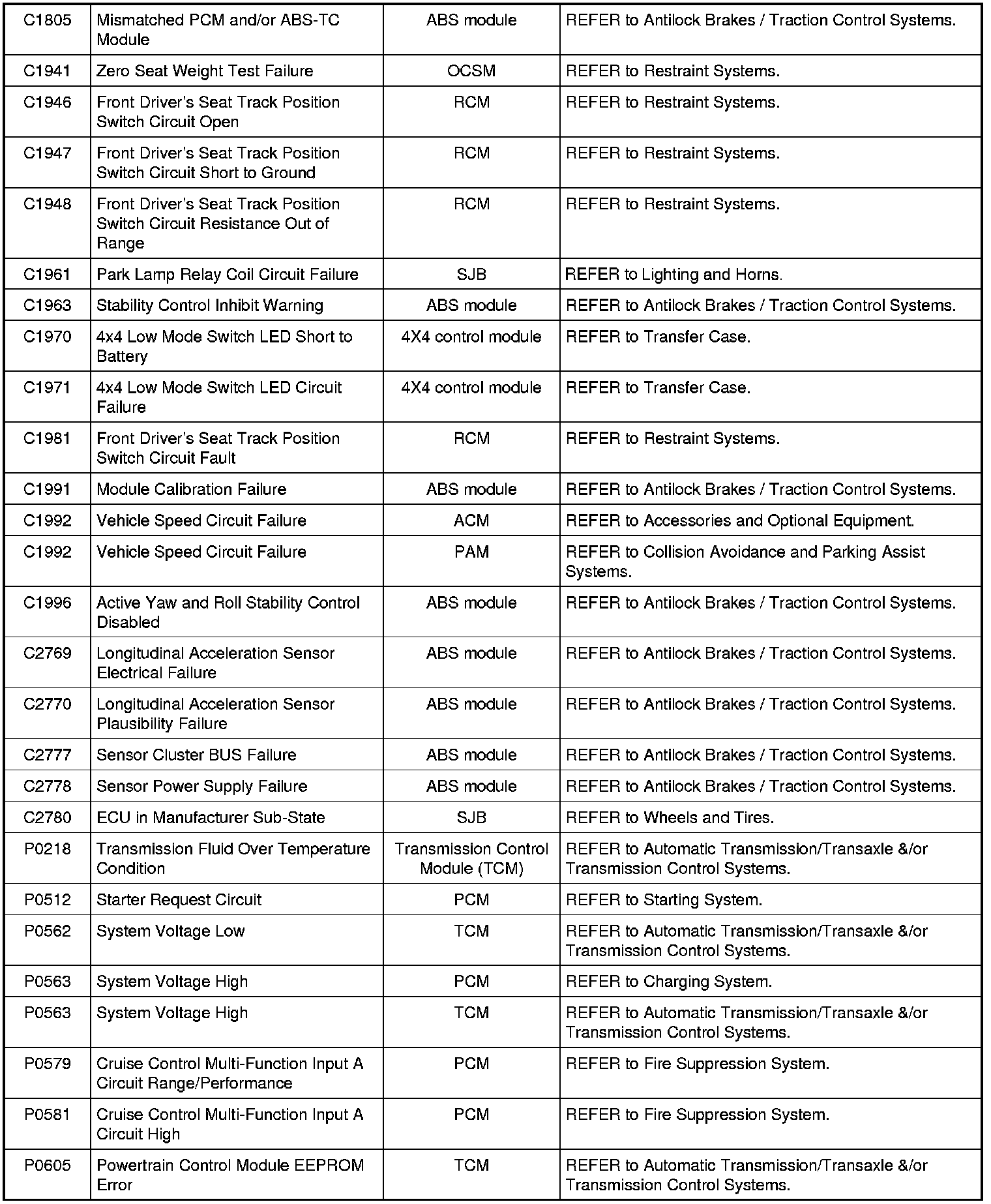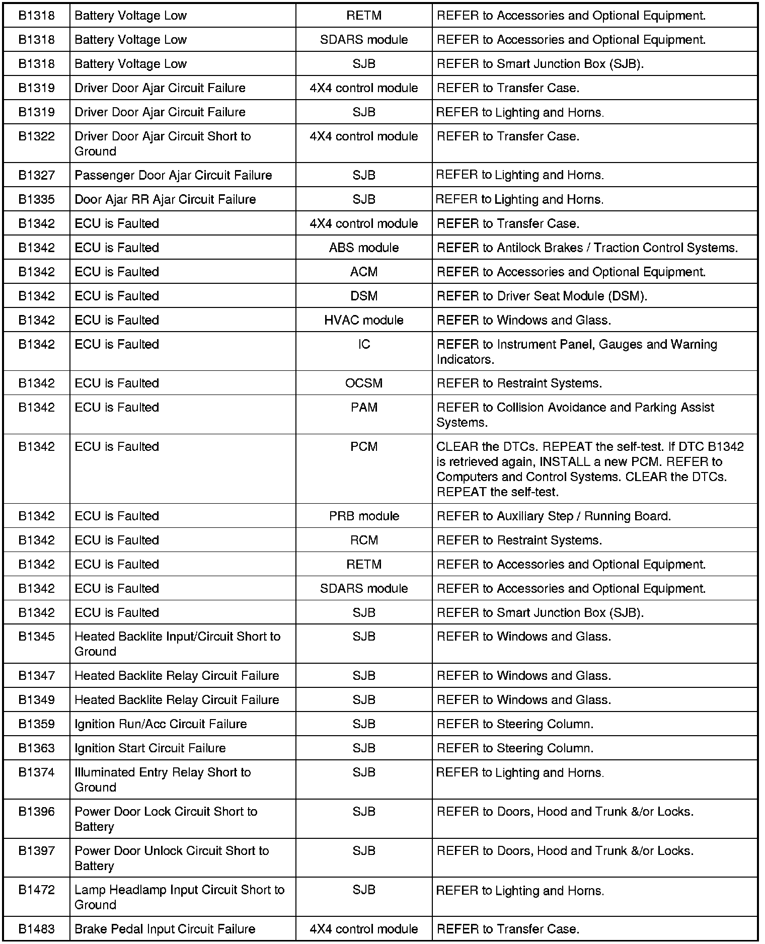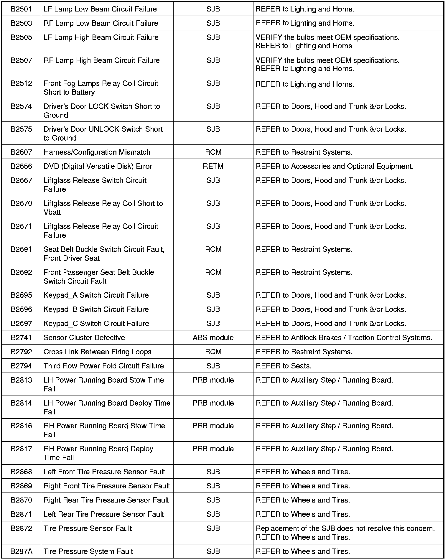 Home >> Ford >> 2010 >> Explorer AWD V8-4.6L >> Repair and Diagnosis >> Body and Frame >> Body Control Systems >> Testing and Inspection >> Diagnostic Trouble Code Descriptions >> Diagnostic Trouble Code (DTC) Chart