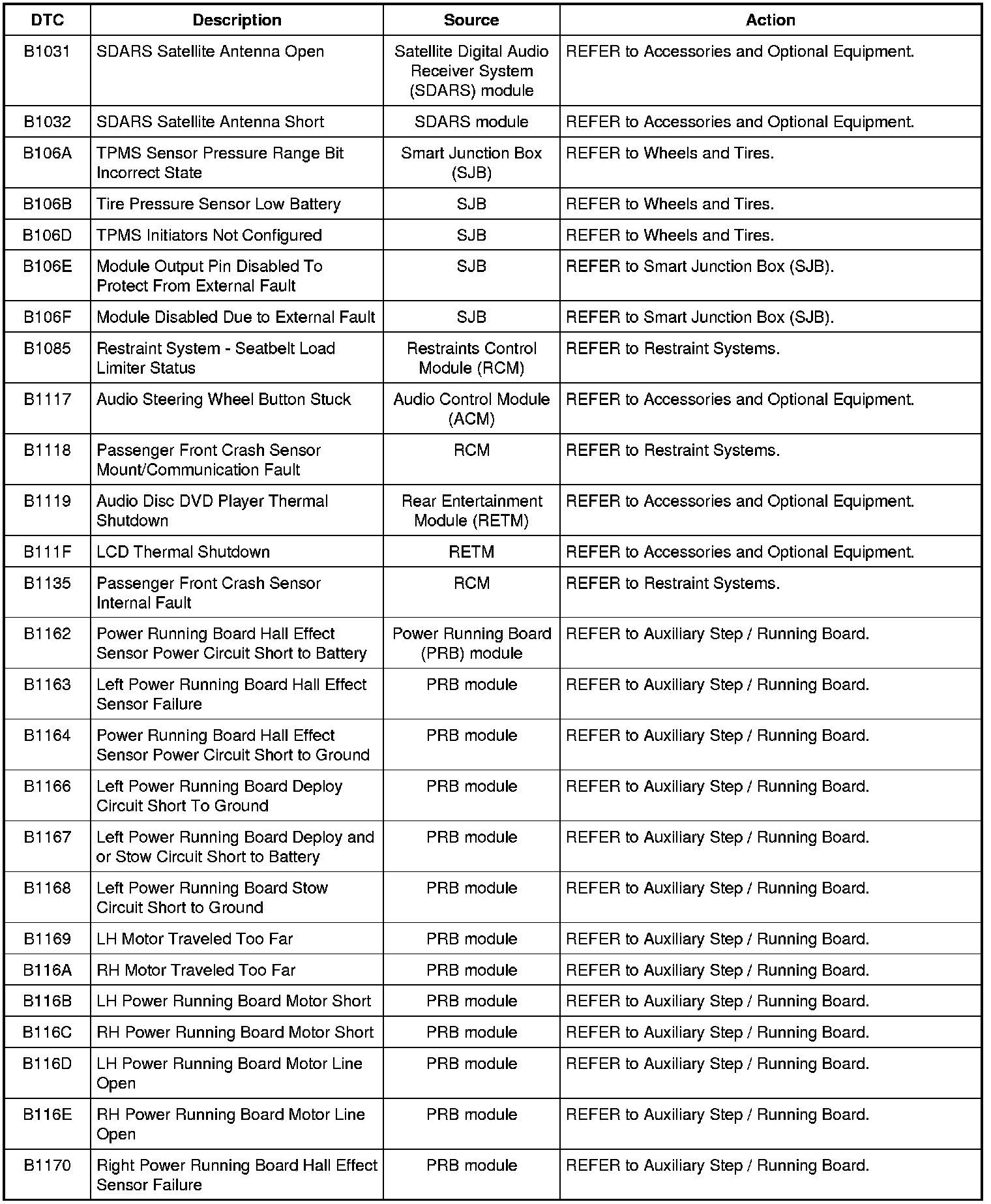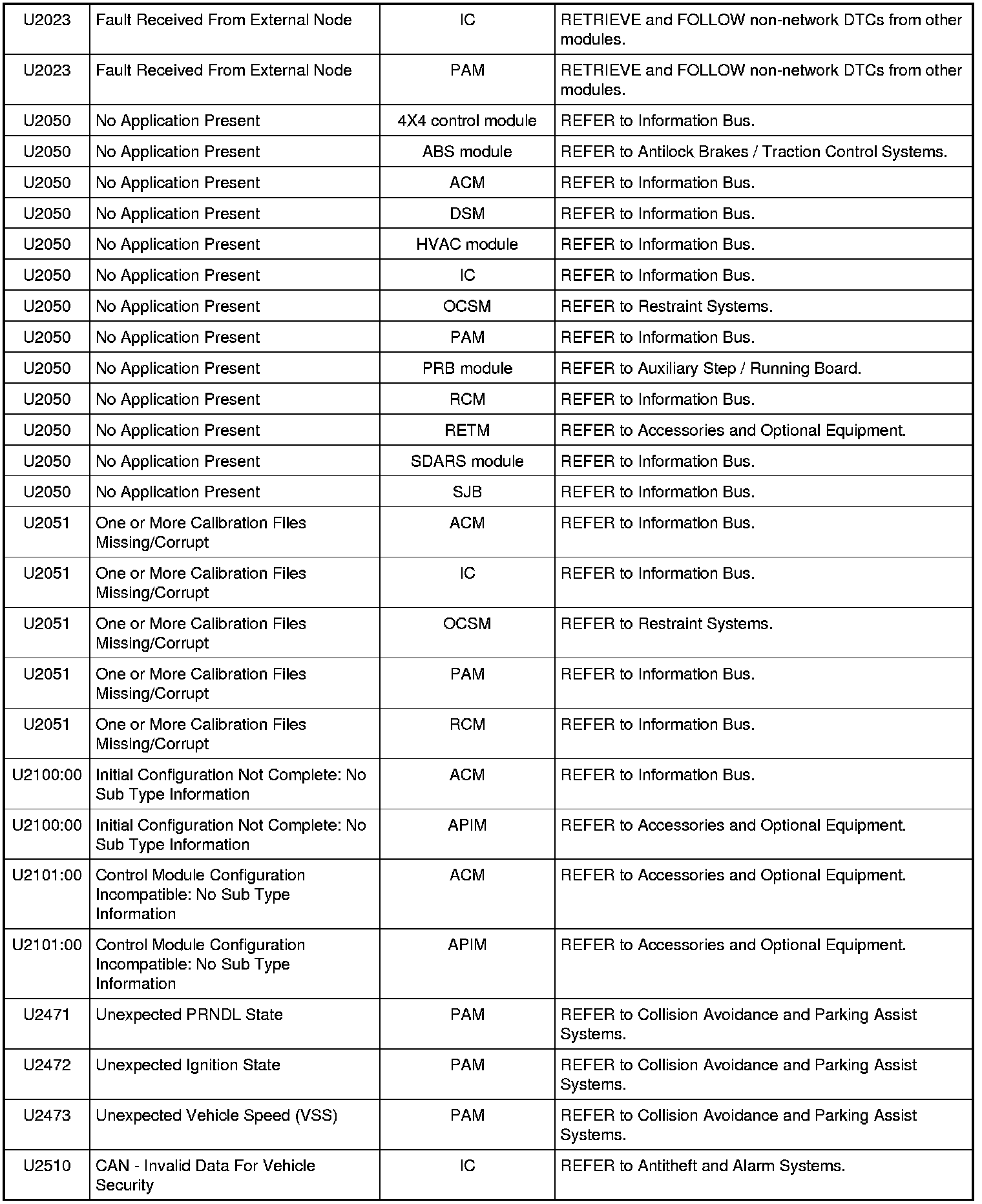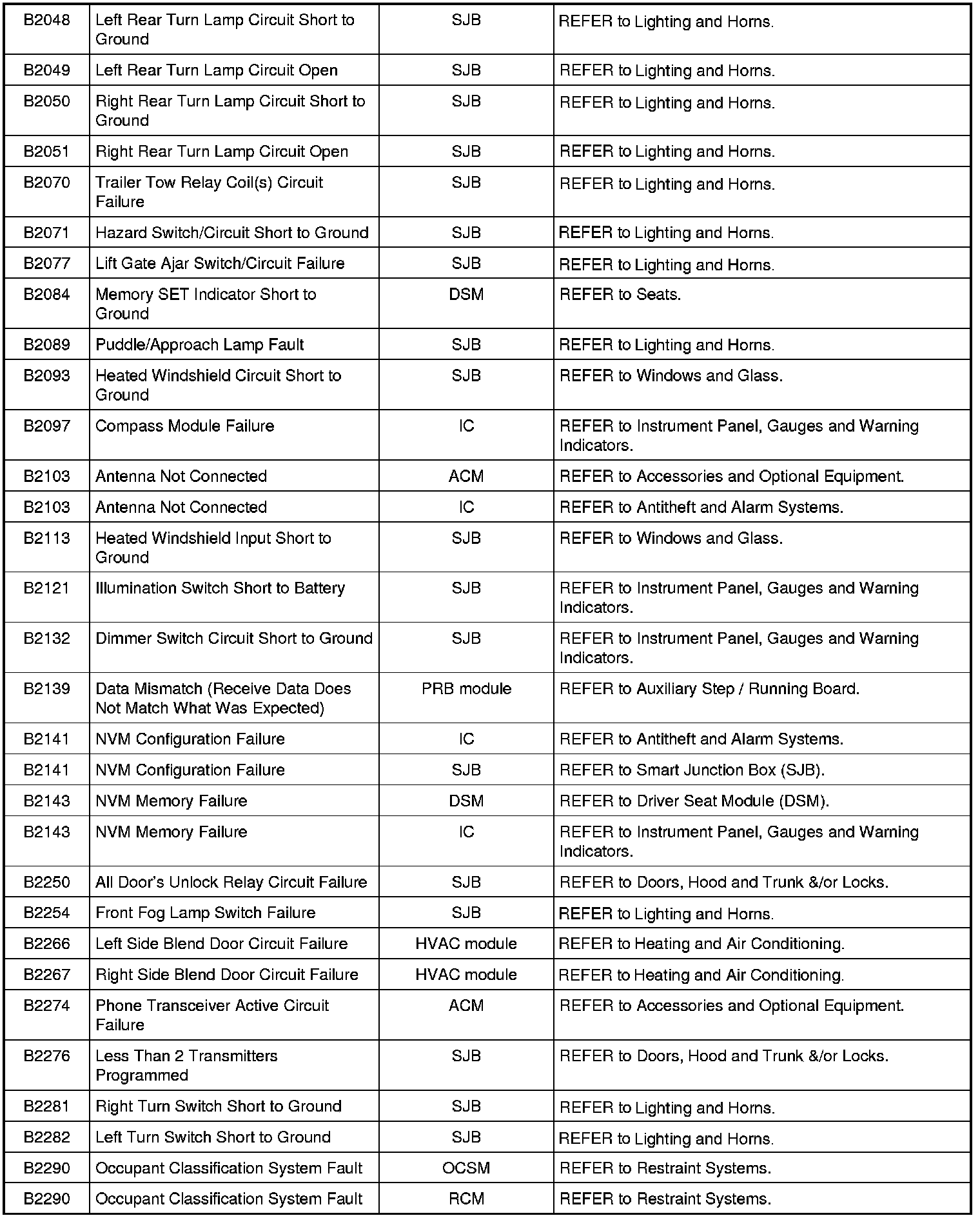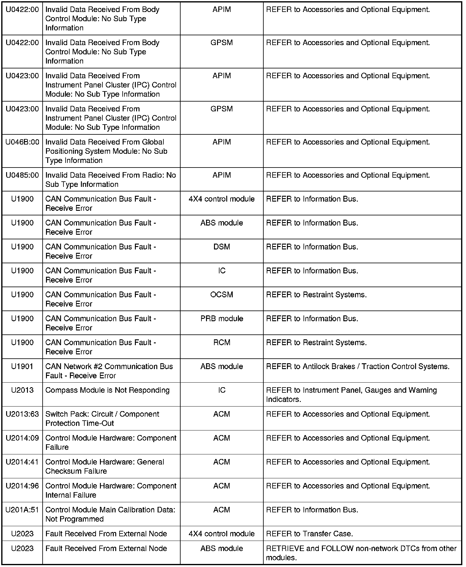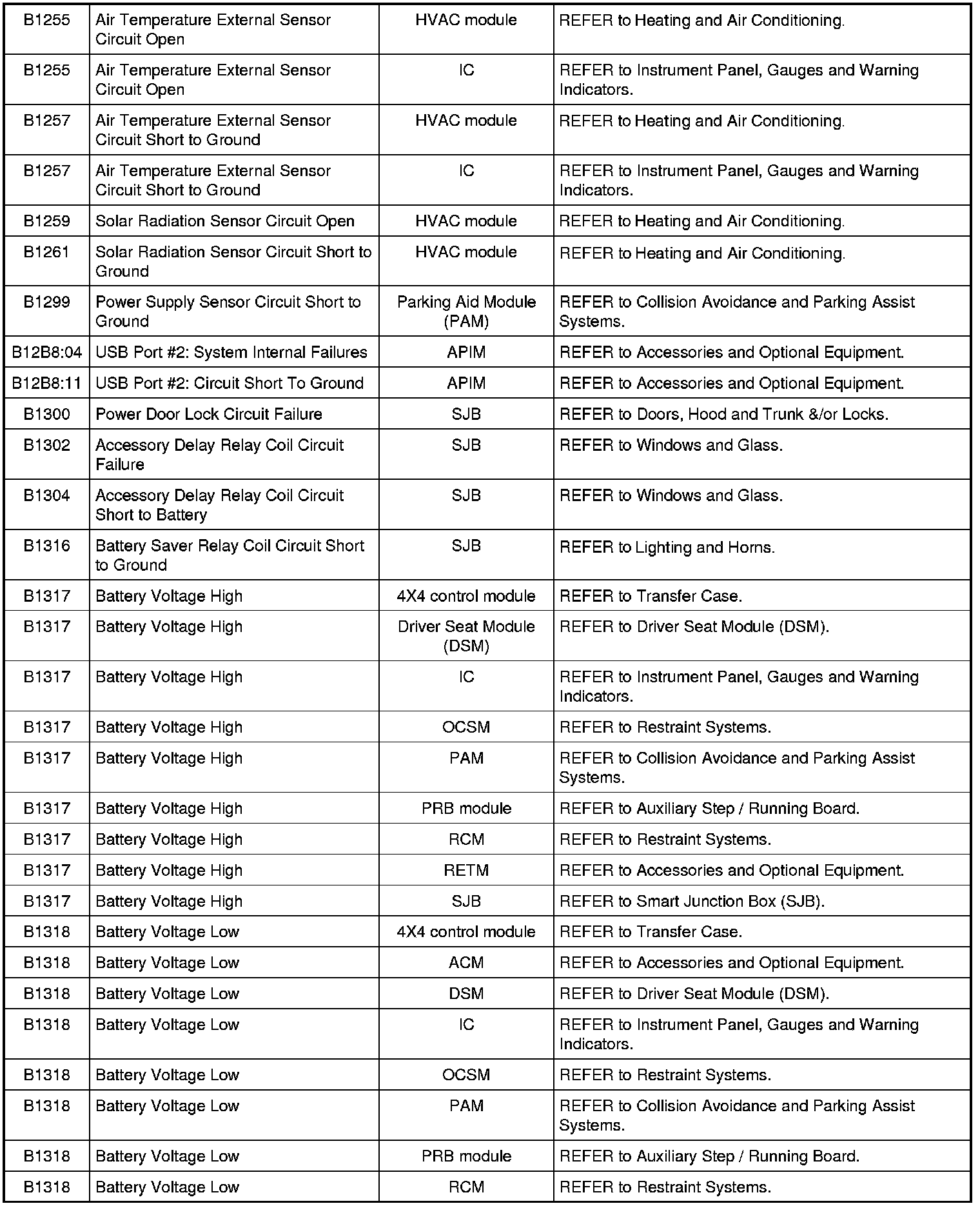 Home >> Ford >> 2010 >> Explorer AWD V8-4.6L >> Repair and Diagnosis >> Body and Frame >> Body Control Systems >> Testing and Inspection >> Diagnostic Trouble Code Descriptions >> Diagnostic Trouble Code (DTC) Chart