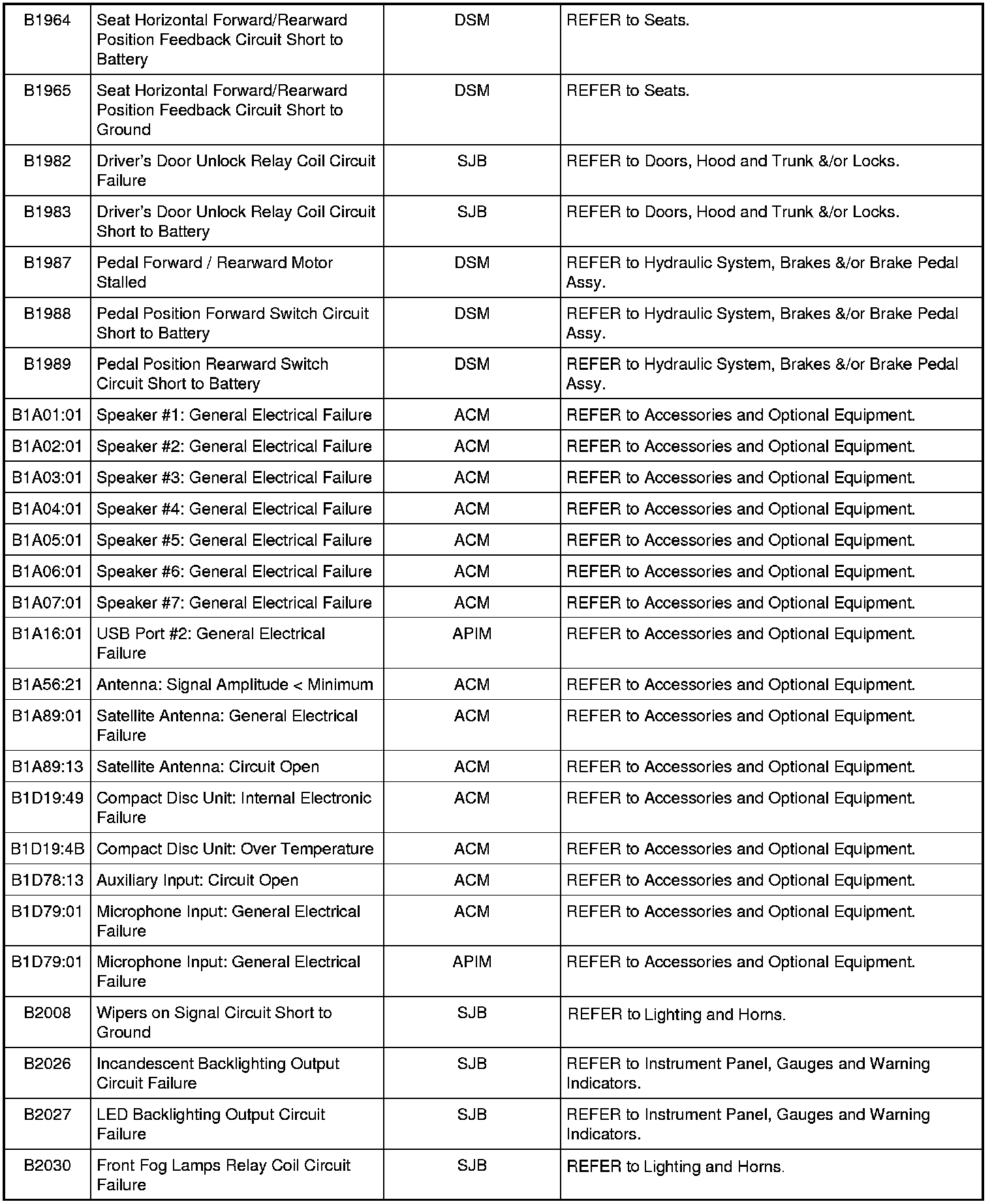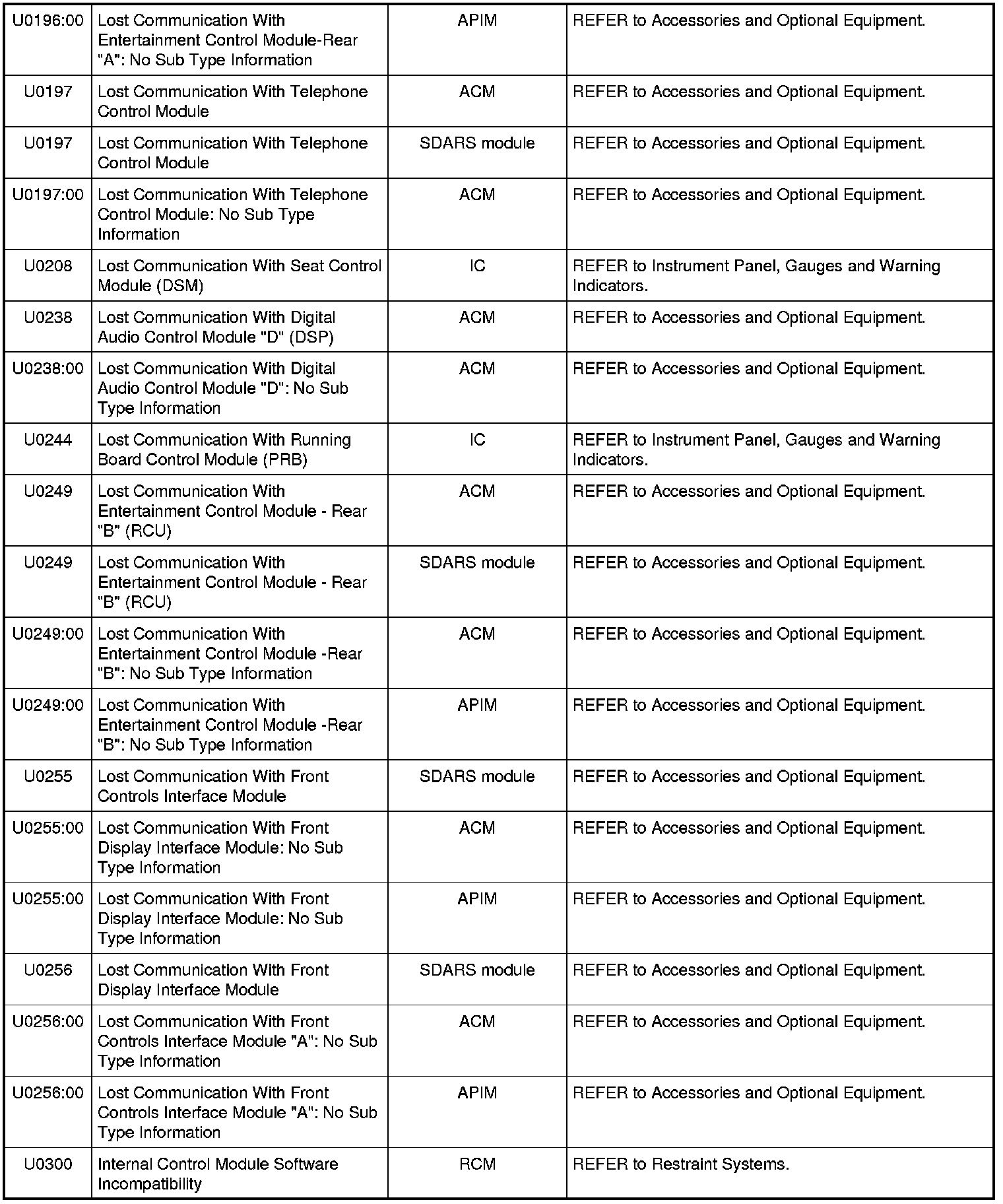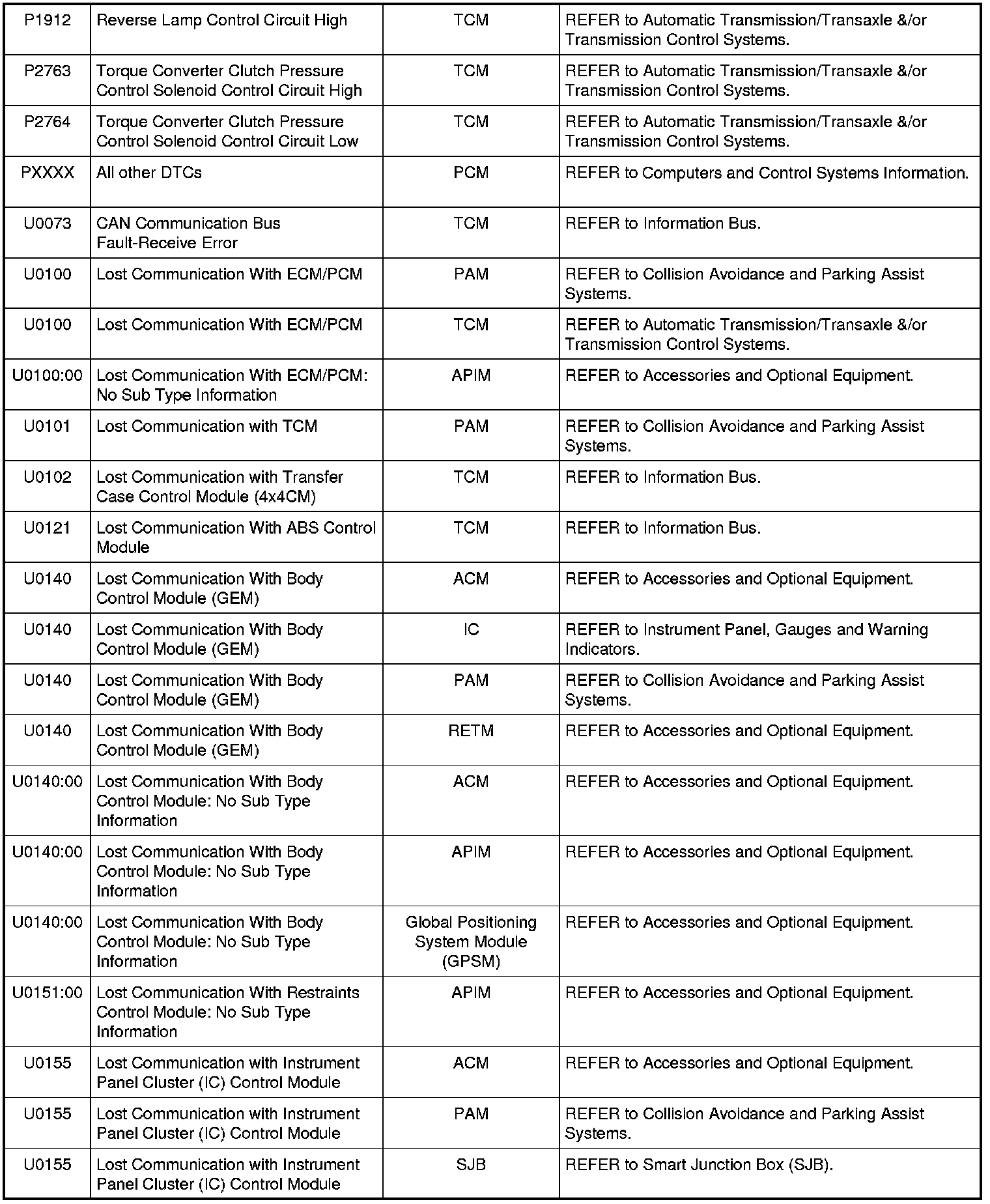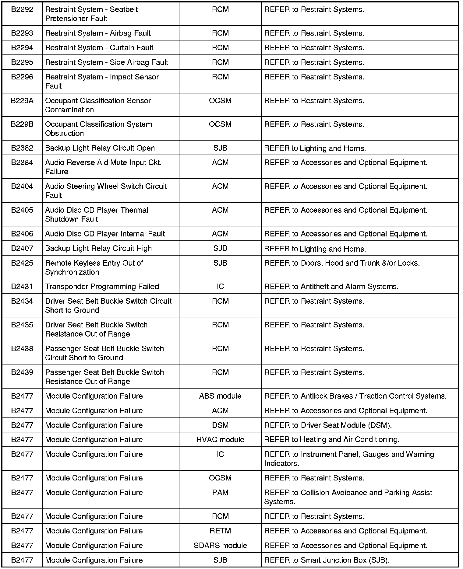 Home >> Ford >> 2010 >> Explorer AWD V8-4.6L >> Repair and Diagnosis >> Body and Frame >> Body Control Systems >> Testing and Inspection >> Diagnostic Trouble Code Descriptions >> Diagnostic Trouble Code (DTC) Chart