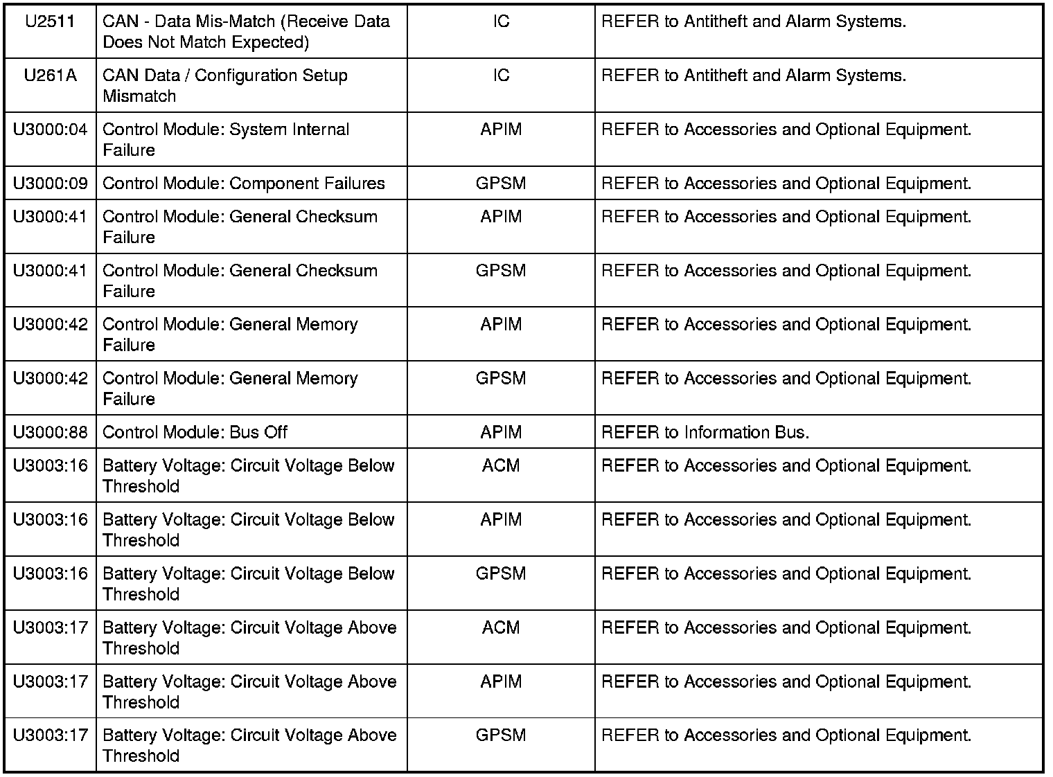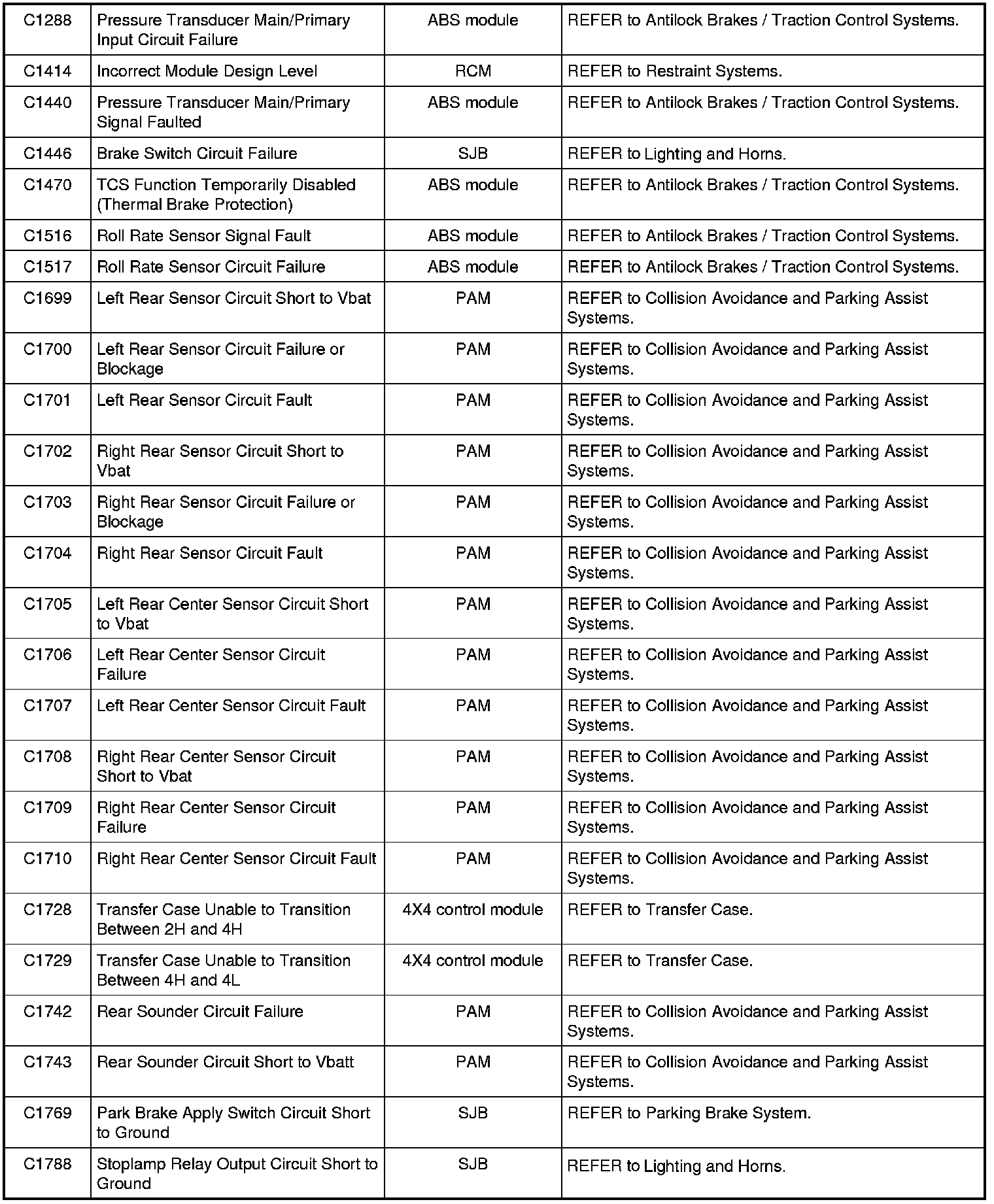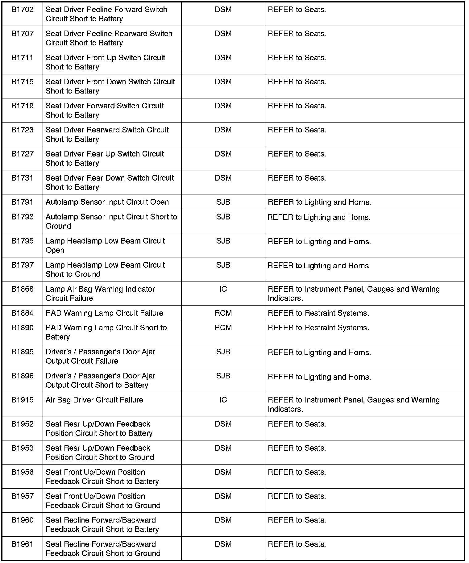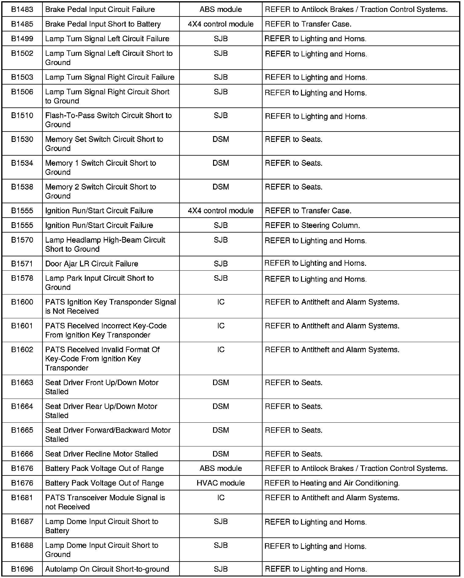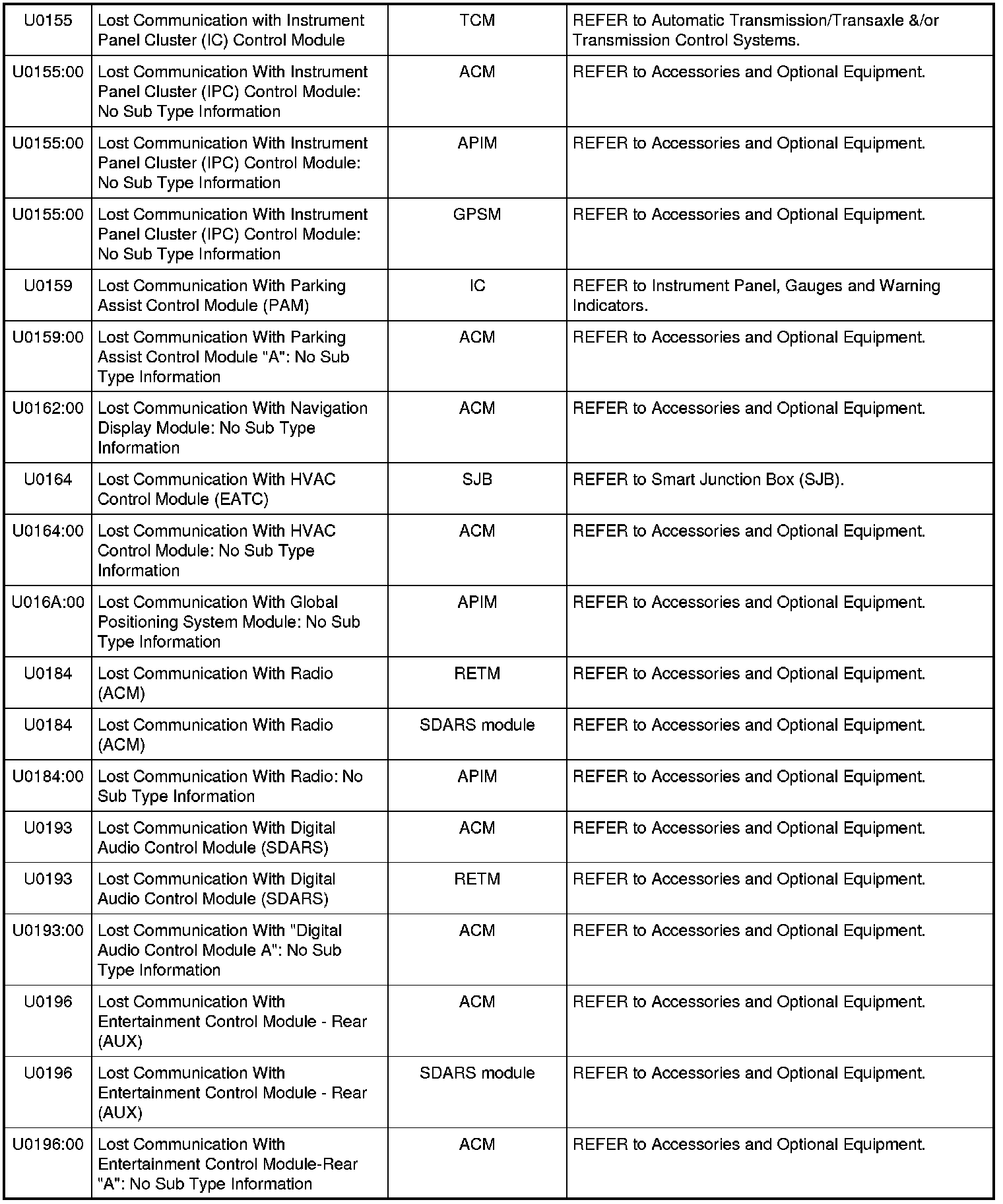 Home >> Ford >> 2010 >> Explorer AWD V8-4.6L >> Repair and Diagnosis >> Body and Frame >> Body Control Systems >> Testing and Inspection >> Diagnostic Trouble Code Descriptions >> Diagnostic Trouble Code (DTC) Chart