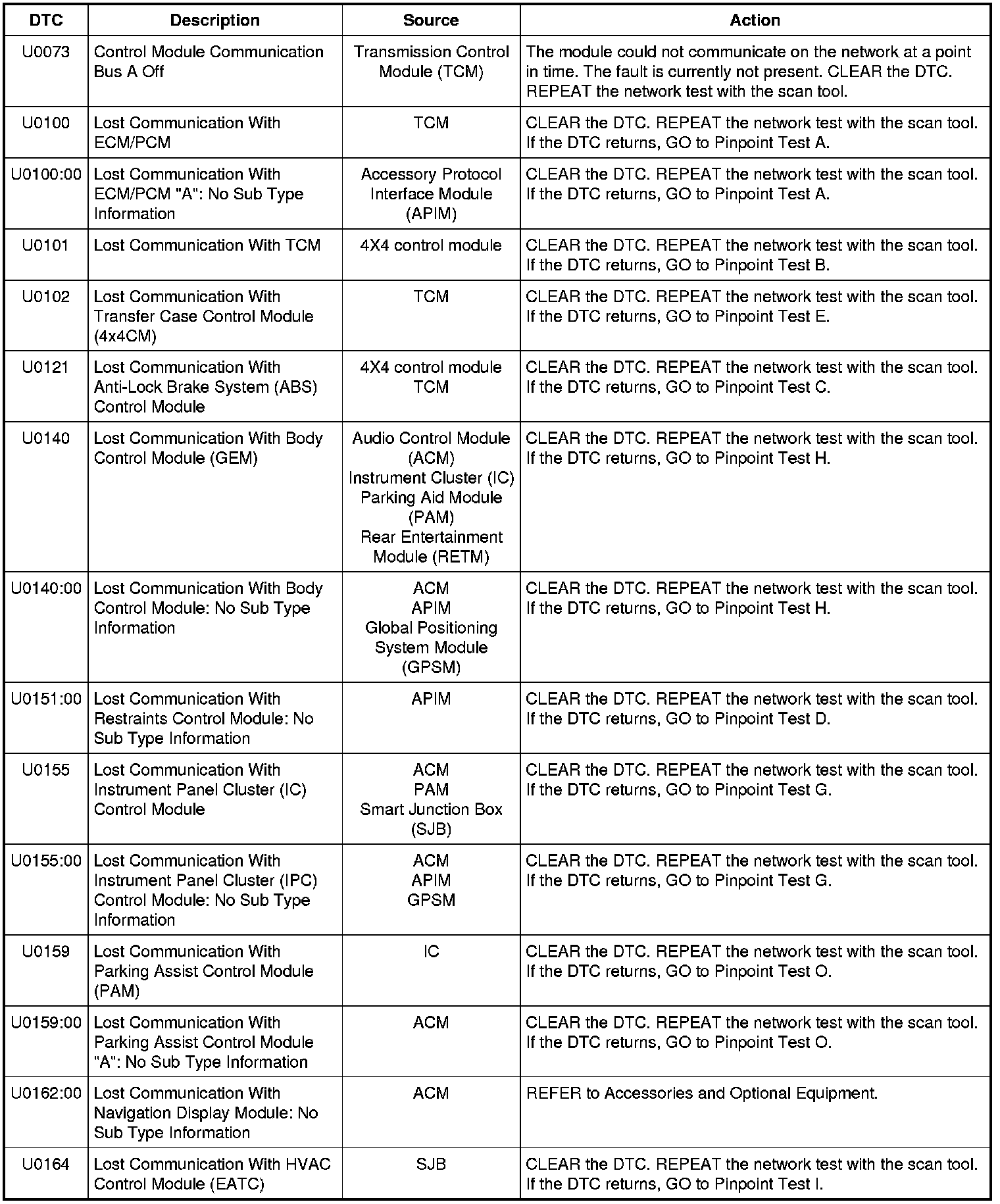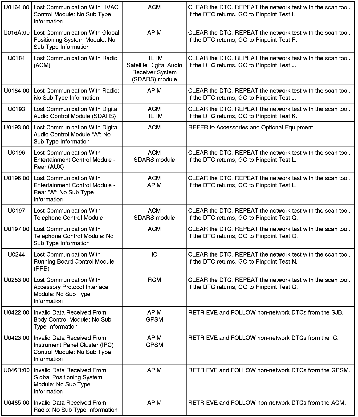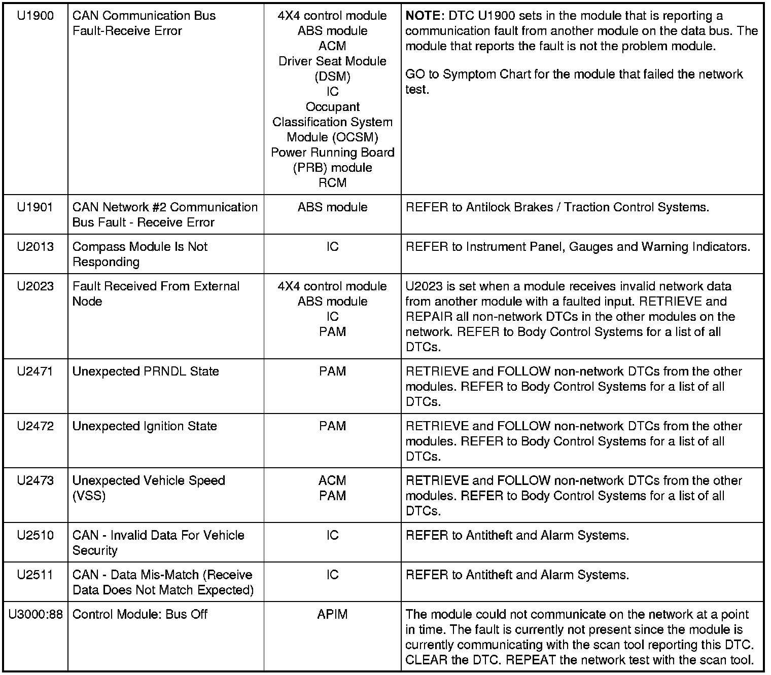 NOTE: Network DTCs (U-codes) are often a result of intermittent concerns such as damaged wiring or low battery voltage occurrences. Additionally, vehicle repair procedures such as module reprogramming often sets network DTCs. Replacing a module to resolve a network DTC is unlikely to resolve the concern. To prevent repeat network DTC concerns, inspect all network wiring, especially connectors. Test the vehicle battery, refer to Battery.