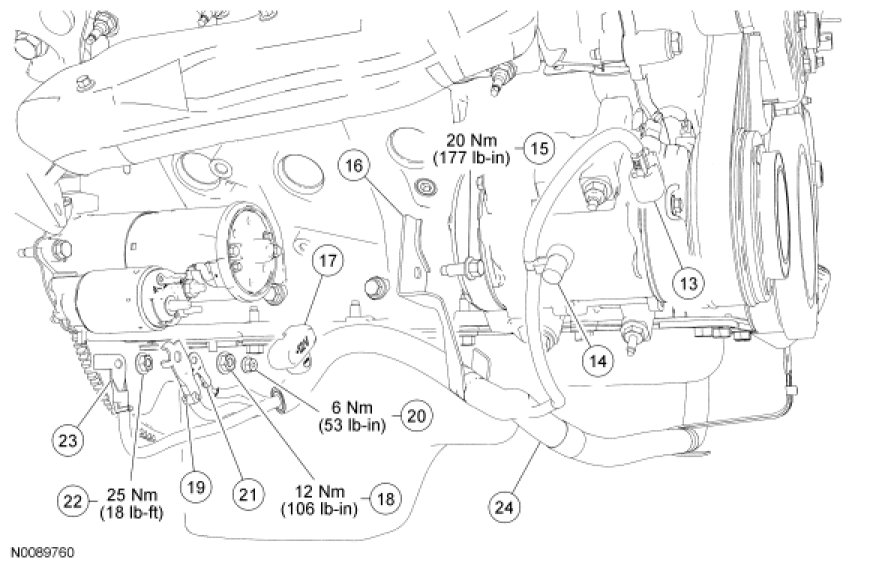 16. Remove the nut and position the starter solenoid positive cable terminal aside.