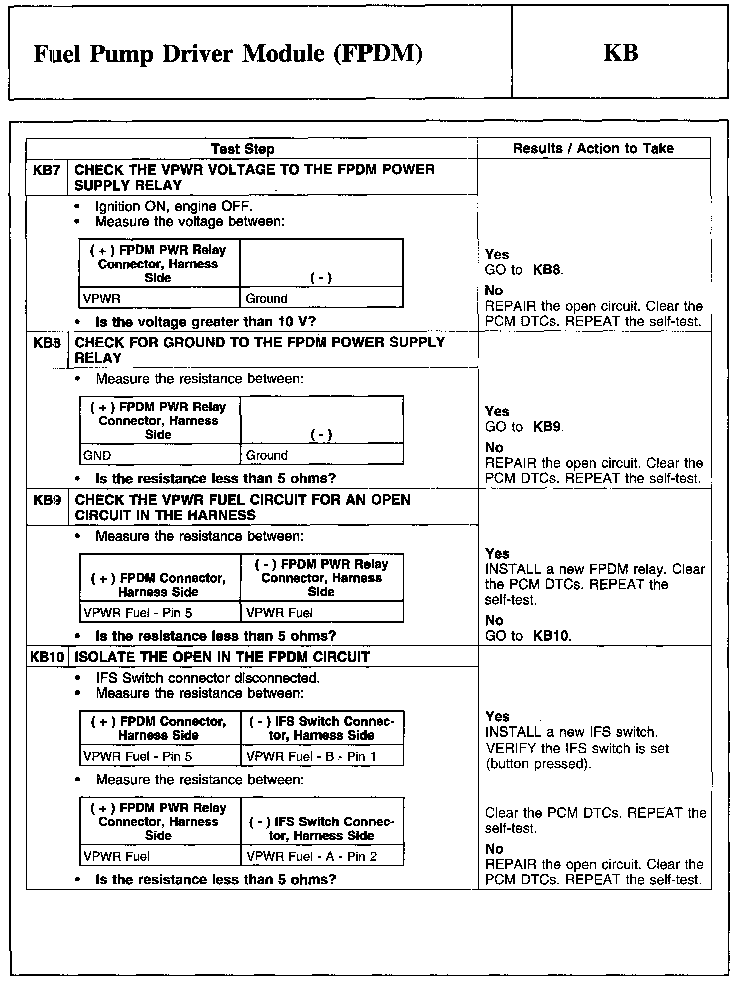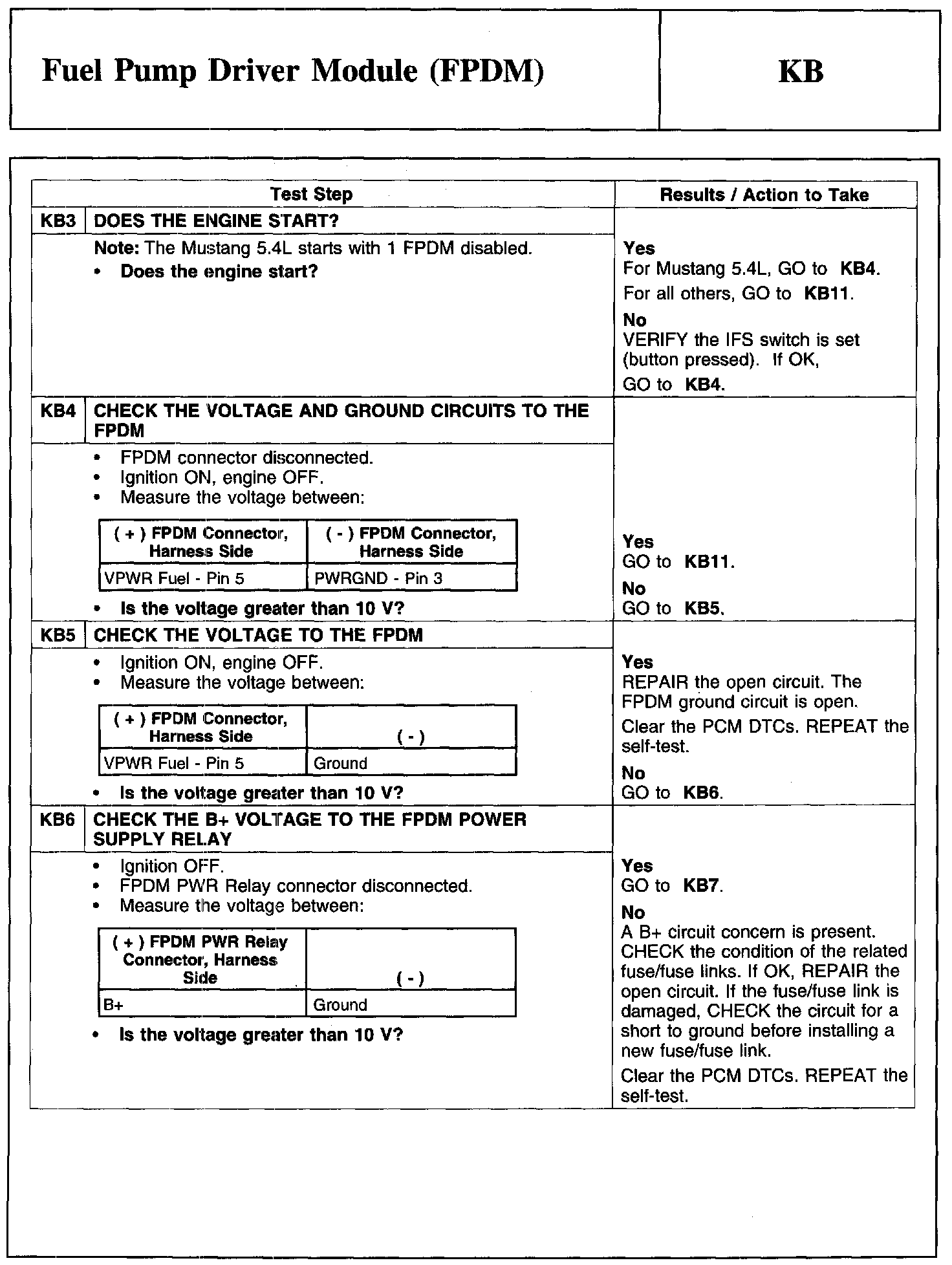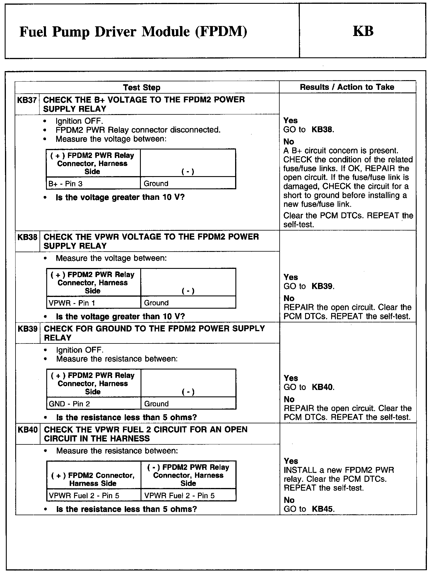 Home >> Ford >> 2010 >> Explorer Sport Trac AWD V8-4.6L >> Repair and Diagnosis >> Powertrain Management >> Computers and Control Systems >> Testing and Inspection >> Pinpoint Tests >> Test KB: Fuel Pump Driver Module (FPDM)