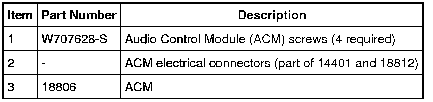 NOTE: It is not necessary to remove the Audio Control Module (ACM) to retrieve the part number. For additional information, refer to Audio Control Module (ACM) Self-Diagnostic Mode Audio Control Module (ACM) Self-Diagnostic Mode.