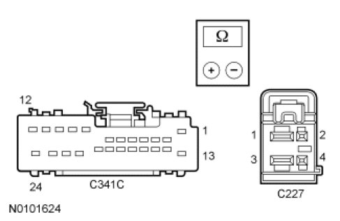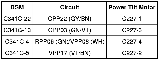 - Measure the resistance between DSM C341C, harness side and the power tilt motor C227, harness side as indicated in the following chart:
