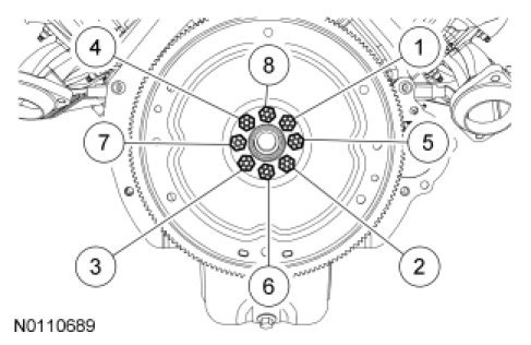 Tighten the 8 new bolts in 6 stages.Stage 1: Tighten fasteners 1 through 4 in sequence to 20 Nm (177 lb-in).