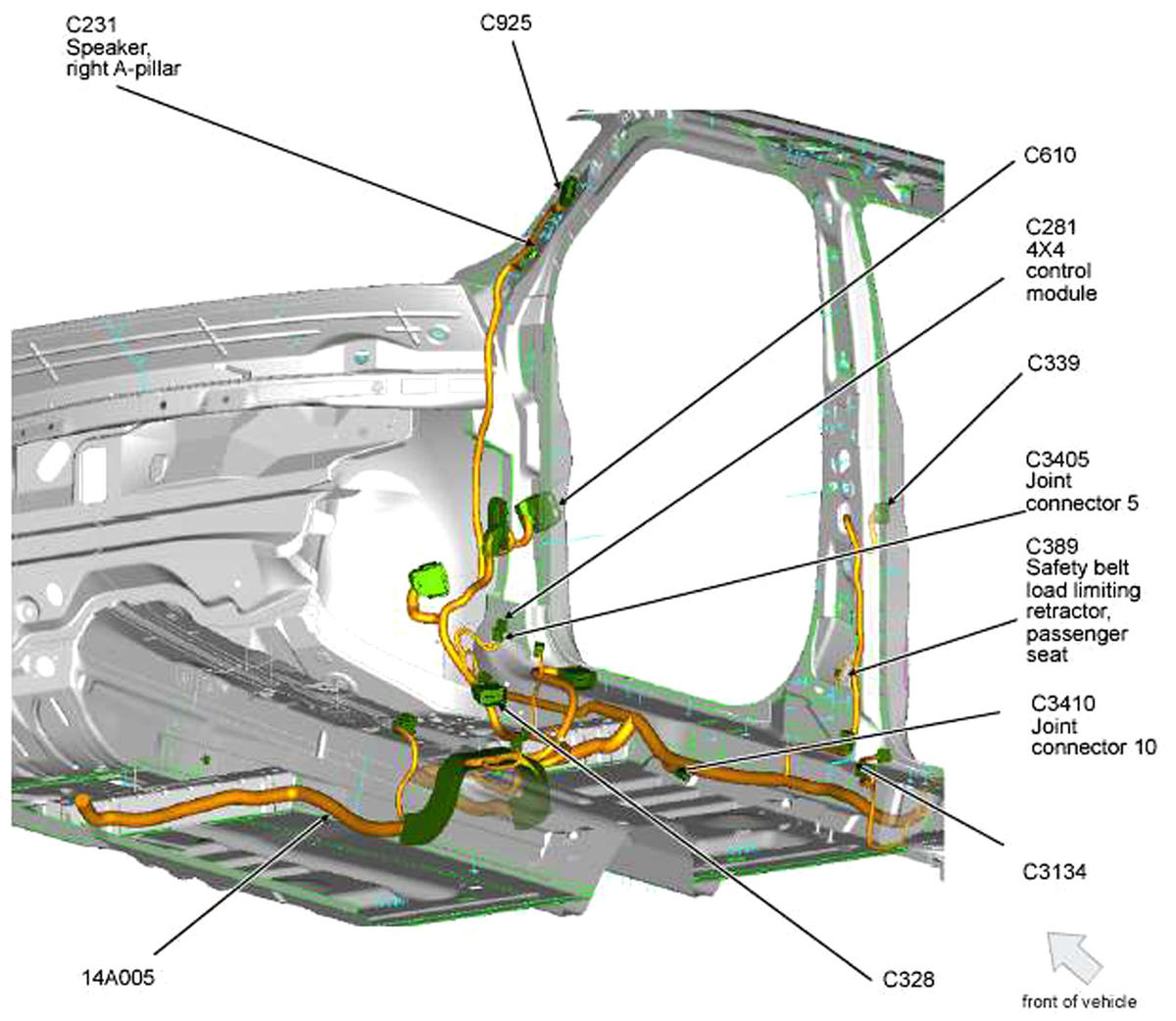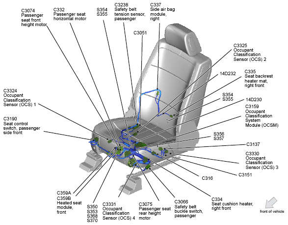 | Occupant Classification System Module (OCSM) | Under front passenger's seat. See Figure. |