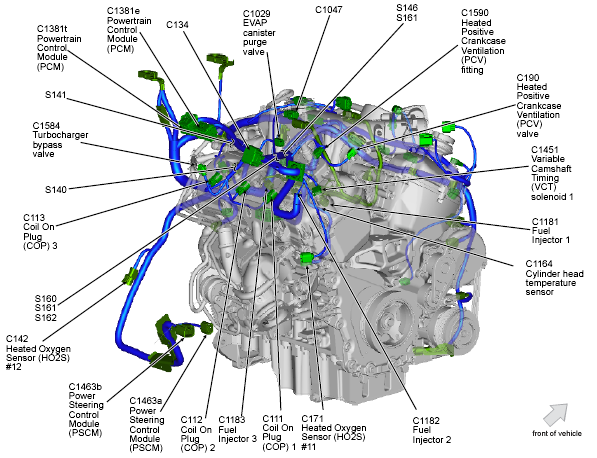 | Powertrain Control Module (PCM) | Rear of engine compartment. See Figure. |