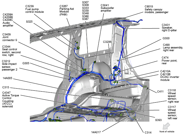 | Parking Aid Module (PAM) | Right "C" pillar. See Figure. |