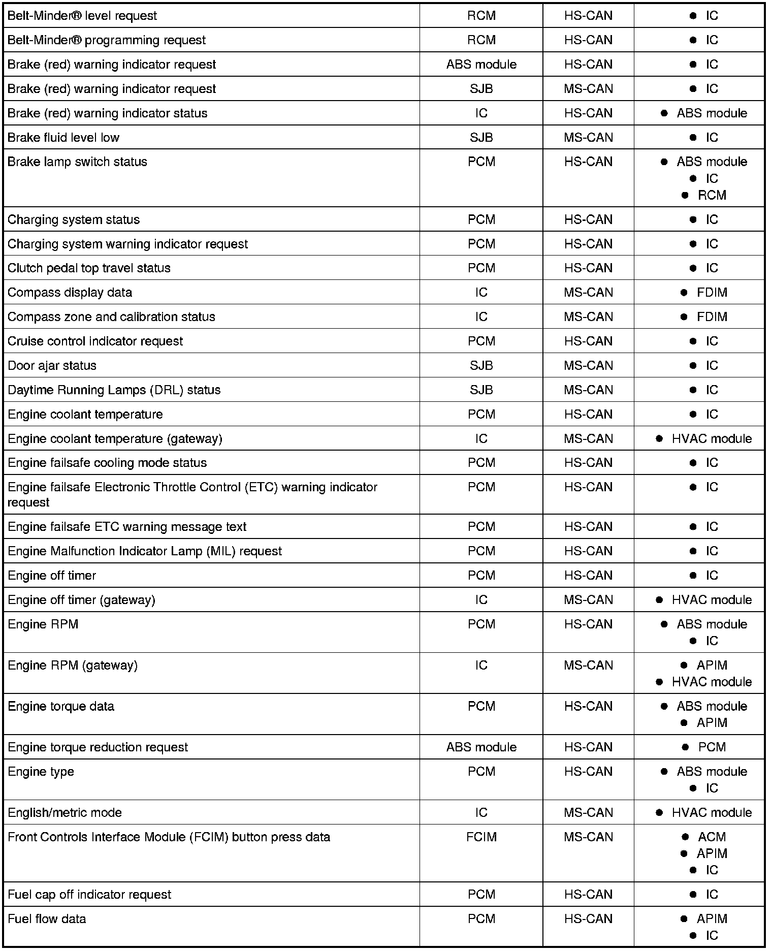 NOTE: This chart describes the specific HS-CAN and MS-CAN messages broadcast by each module, and the module(s) that receive the message.
