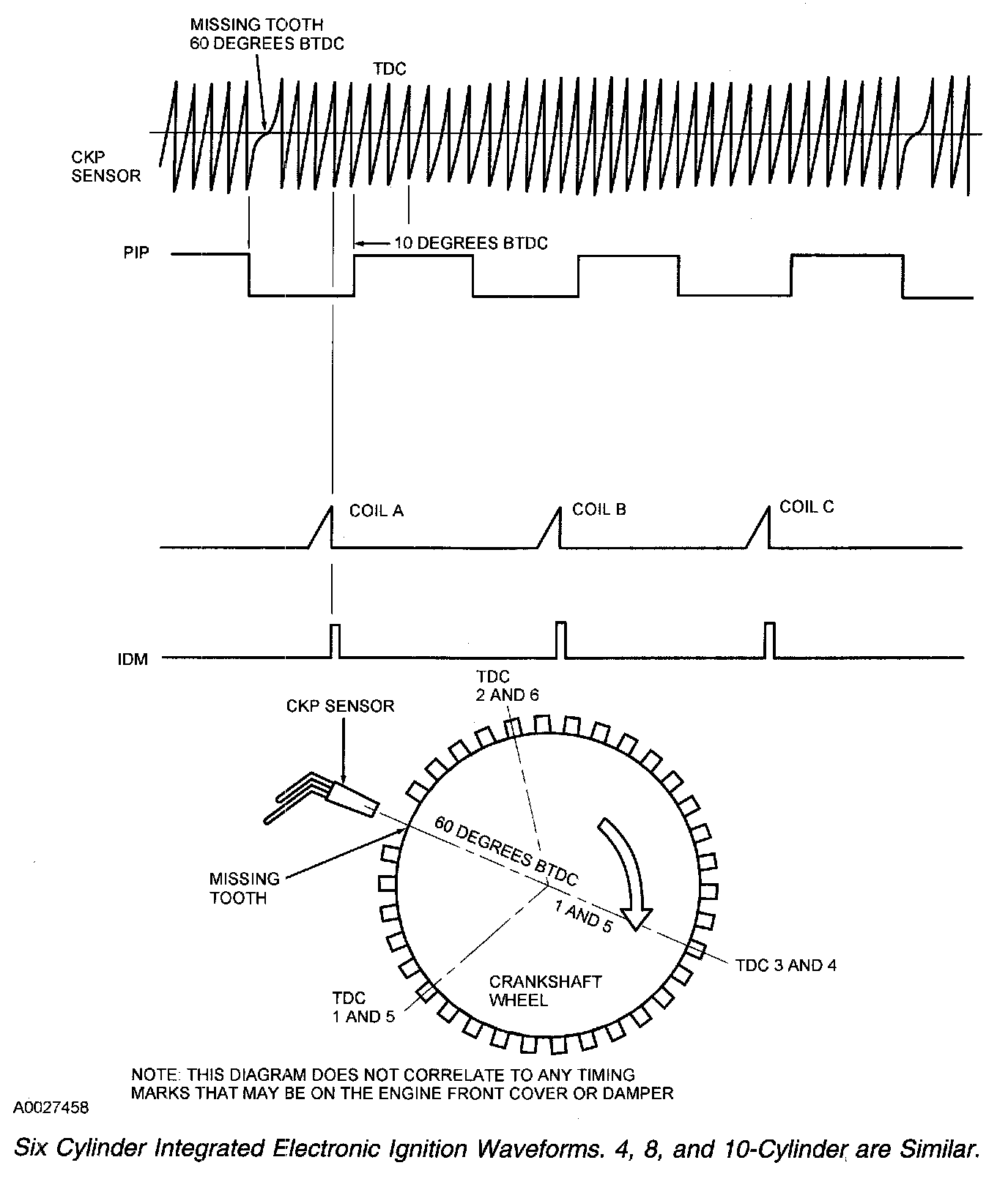 1. The CKP sensor indicates the crankshaft position and speed by sensing a missing tooth on a pulse wheel mounted to the crankshaft. The CMP sensor is used by the COP integrated electronic ignition system to identify the compression stroke of cylinder 1 and to synchronize the firing of the individual coils.