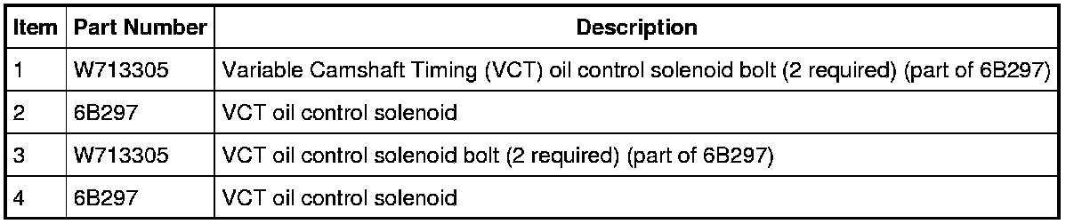 2. Remove the 2 bolts and the Variable Camshaft Timing (VCT) oil control solenoid.