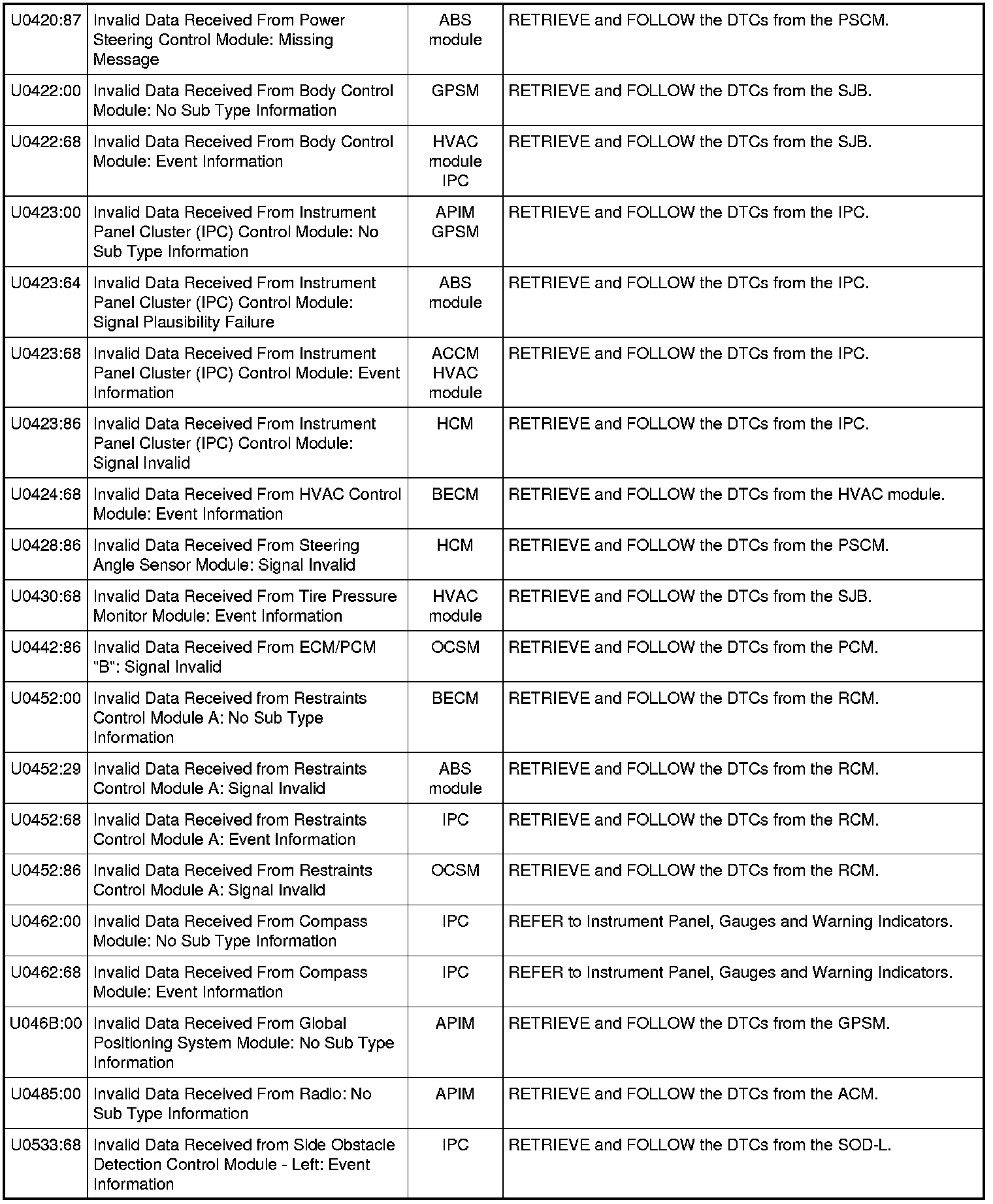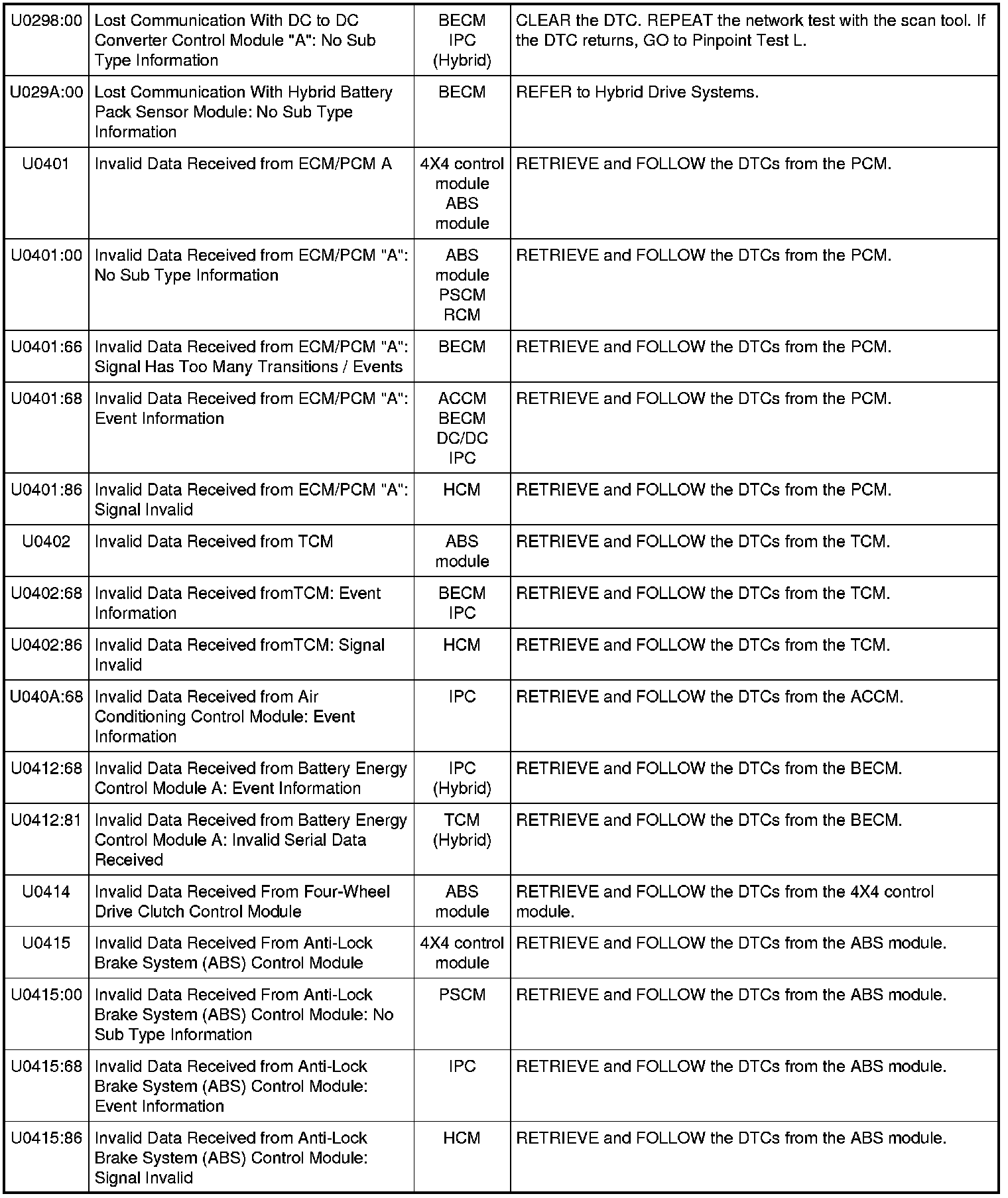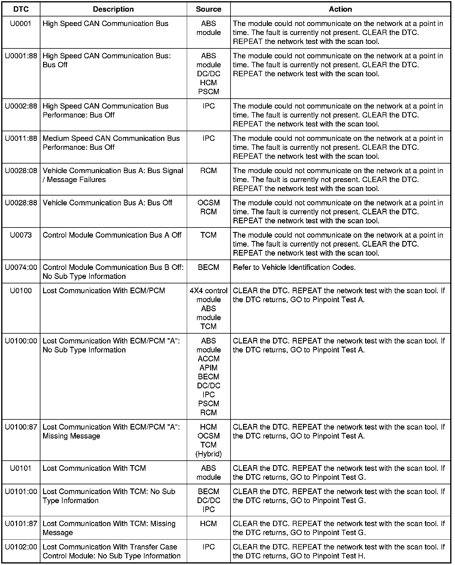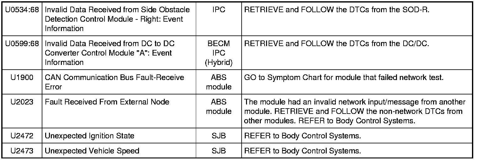 NOTE: Network DTCs (U-codes) are often a result of intermittent concerns such as damaged wiring or low battery voltage occurrences. Additionally, vehicle service procedures such as module reprogramming will often set network DTCs. Replacing a module to resolve a network DTC is unlikely to resolve the concern. To prevent repeat network DTC concerns, inspect all network wiring, especially connectors. Test the vehicle battery, refer to Battery.