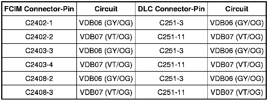 - Measure the resistance between the FCIM, harness side and the Data Link Connector (DLC) harness side as follows:
