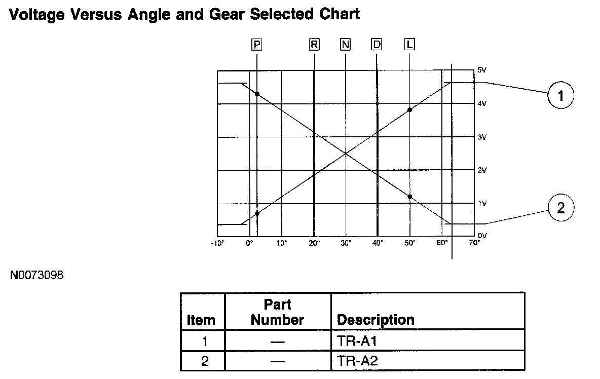 The TR-A1 signal has a positive voltage slope, meaning the voltage increases when the sensor angle increases. The typical TR voltage ranges from approximately 0.7 volt in the PARK position to approximately 3.8 volts in the LOW gear position. The TR-A2 signal has a negative voltage slope. Voltage decreases as the sensor angle increases. The typical voltage for the TR-A2 is approximately 4.3 volts in the PARK position to approximately 1.2 volts in the LOW gear position.