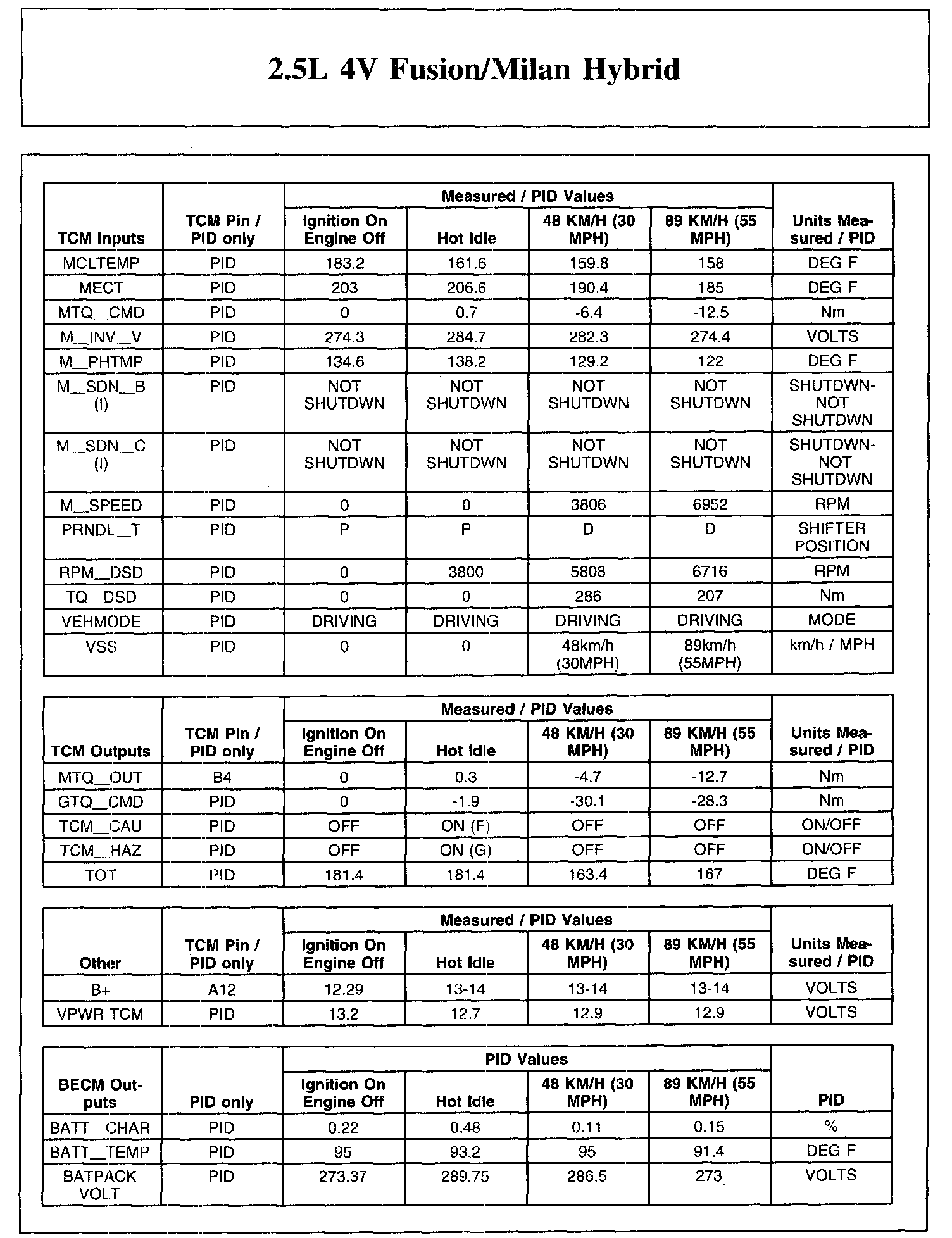 The Typical Diagnostic Reference Value Charts do not display fault parameter identifications (PIDs). These are PIDs which indicate a hard fault with the circuit. They display a value of YES or NO and are PIDs ending with an F.