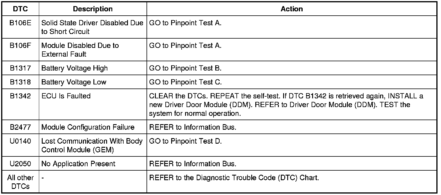 Driver Door Module (DDM) DTC Chart