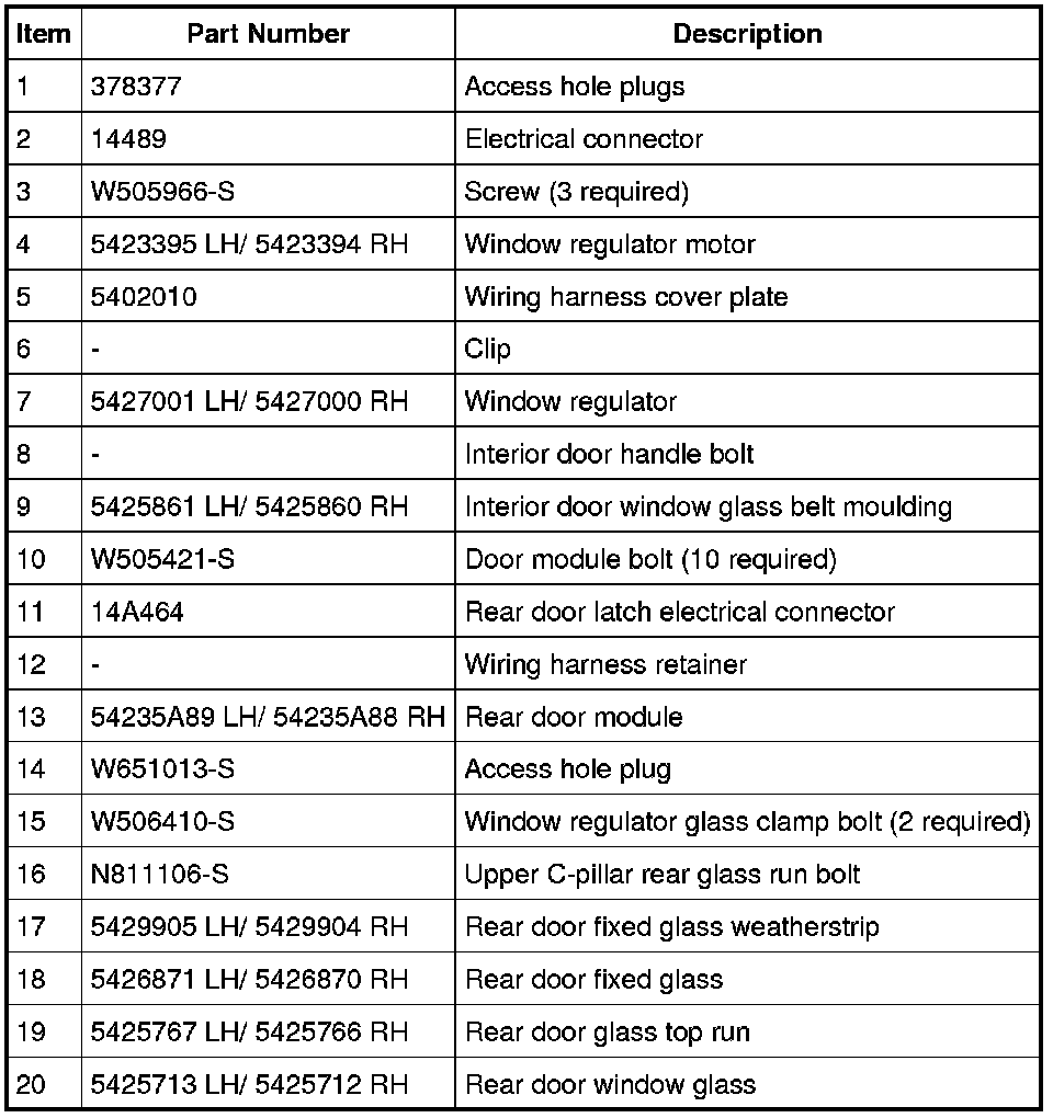 Glass, Frames and Mechanisms - Exploded View, Rear Door