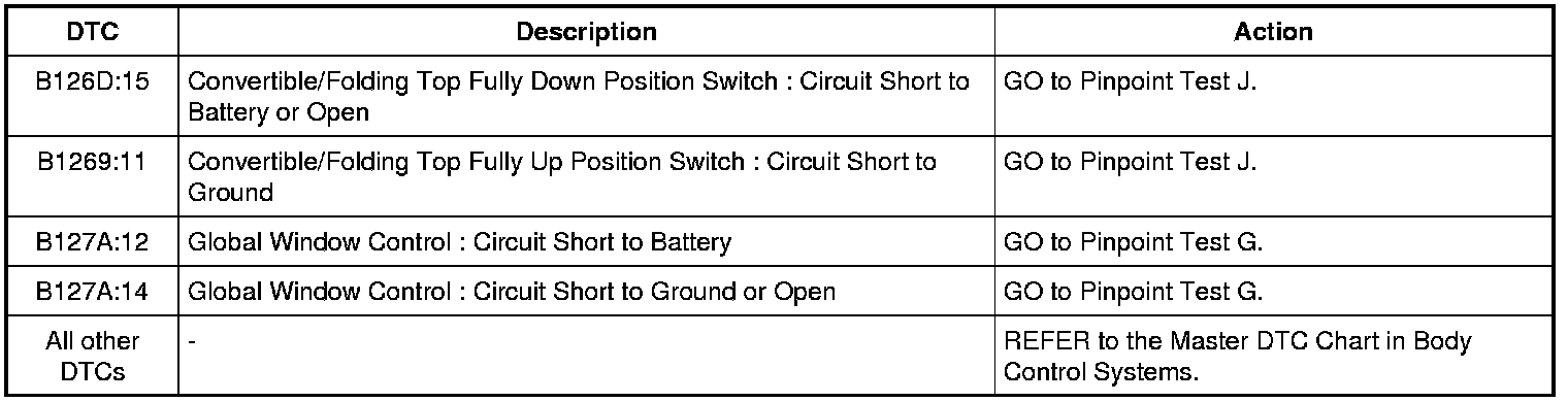 NOTE: This module utilizes a 5-character DTC followed by a 2-character failure type code. The failure type code provides information about specific fault conditions such as opens or shorts to ground. Continuous Memory Diagnostic Trouble Codes (CMDTCs) have an additional 2-character DTC status code suffix to assist in determining DTC history.
