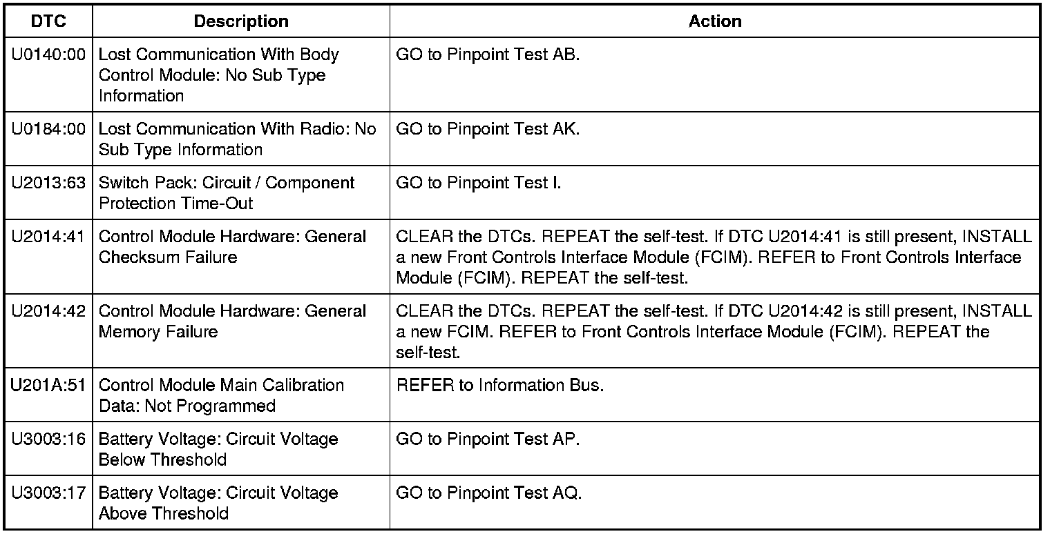 Home >> Ford >> 2010 >> Mustang V8-5.4L SC >> Repair and Diagnosis >> Accessories and Optional Equipment >> Testing and Inspection >> Diagnostic Trouble Code Tests and Associated Procedures >> Front Controls Interface Module (FCIM) DTC Chart