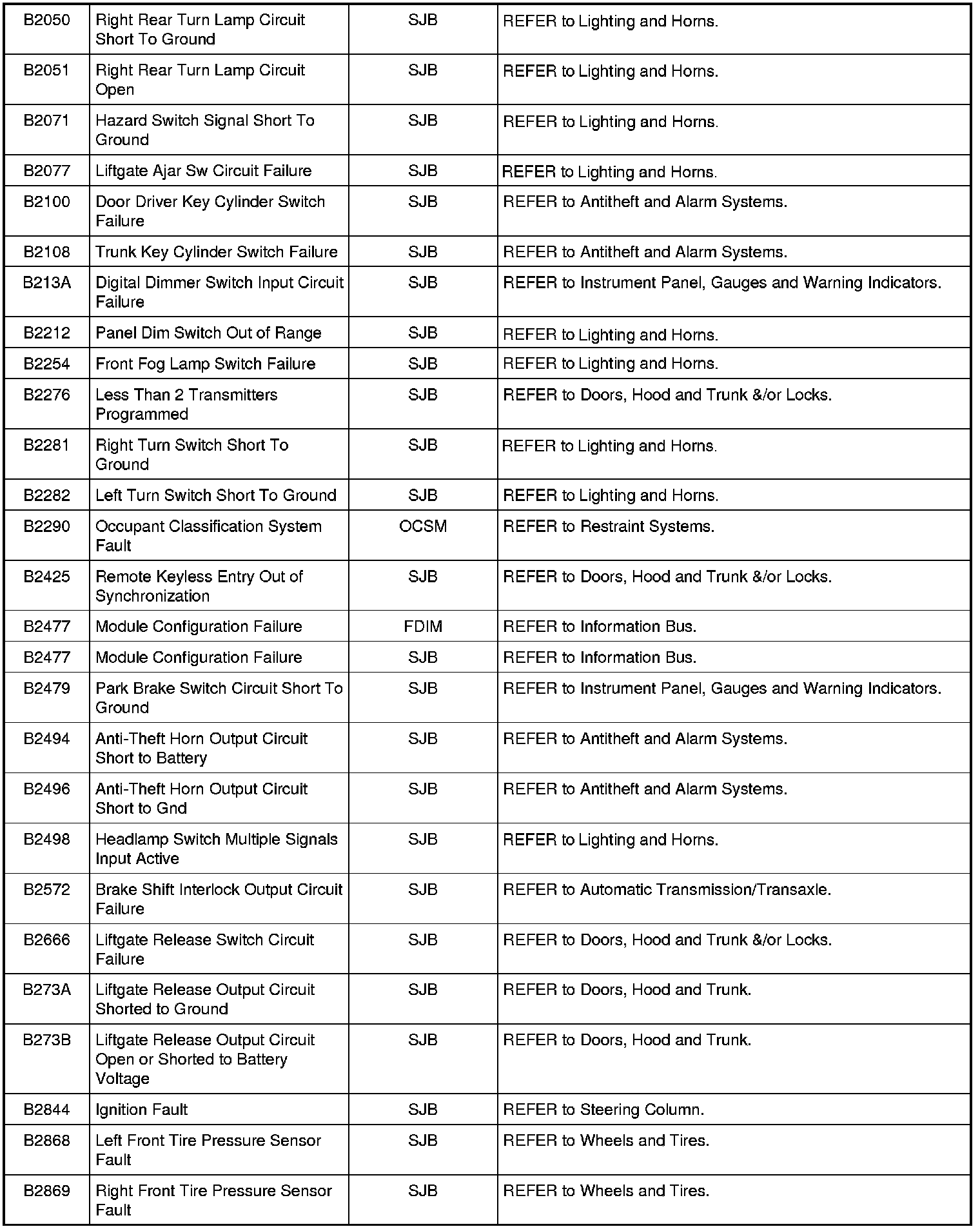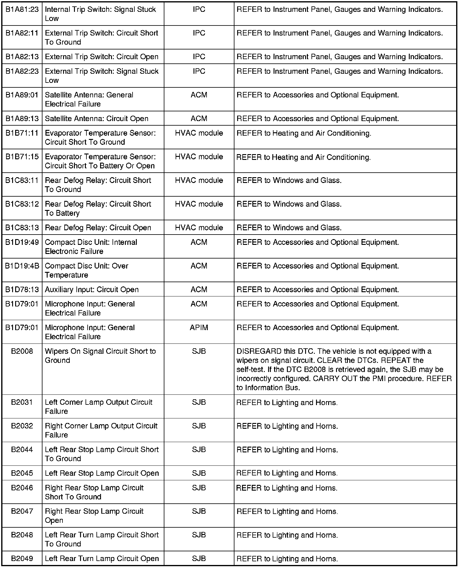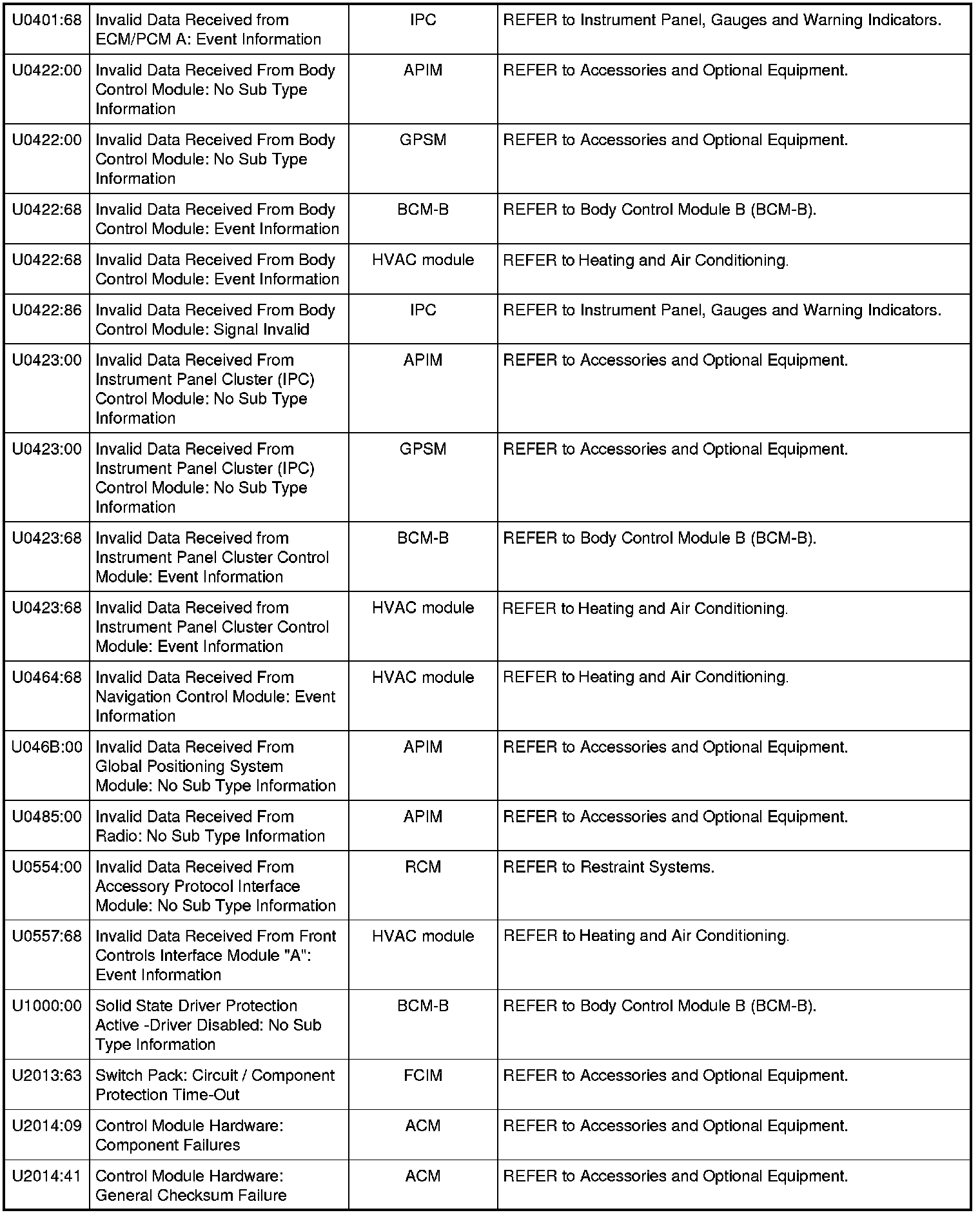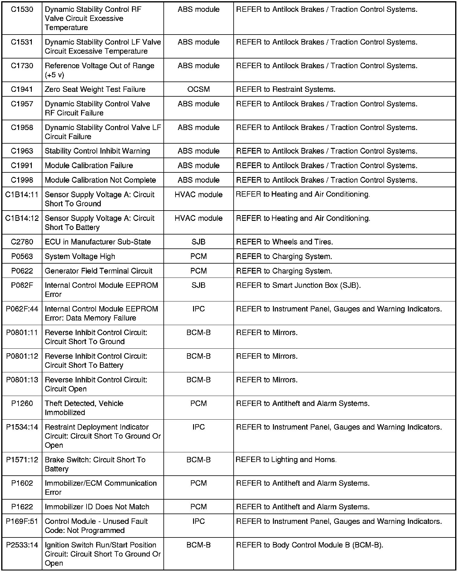 Home >> Ford >> 2010 >> Mustang V8-5.4L SC >> Repair and Diagnosis >> Body and Frame >> Body Control Systems >> Testing and Inspection >> Diagnostic Trouble Code Descriptions >> Diagnostic Trouble Code (DTC) Chart