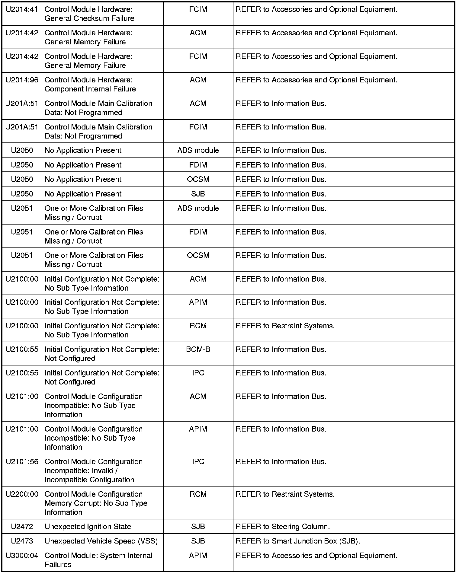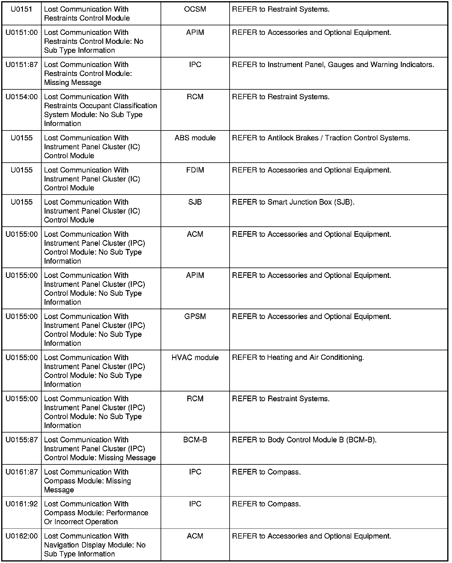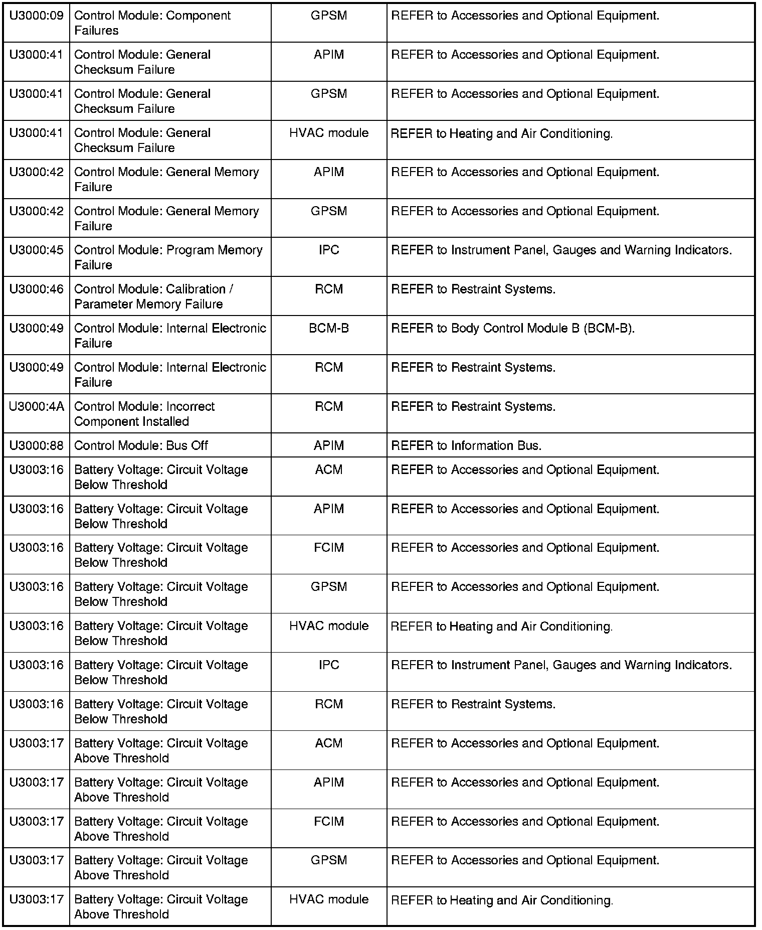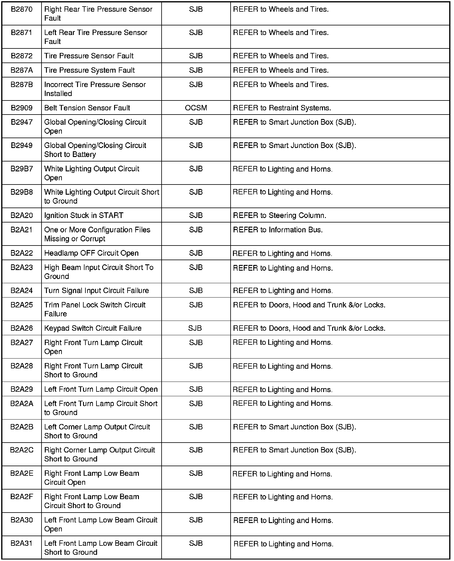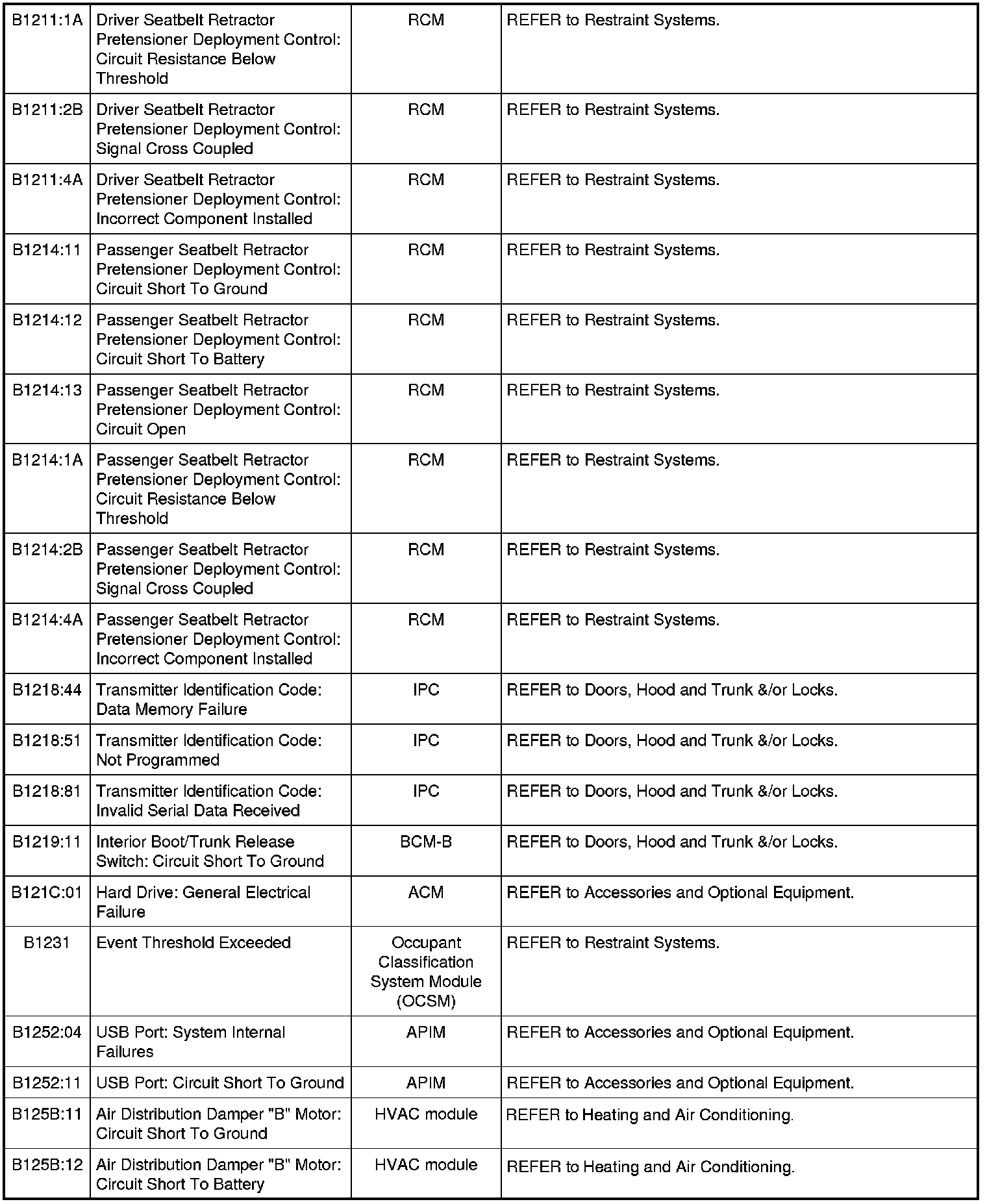 Home >> Ford >> 2010 >> Mustang V8-5.4L SC >> Repair and Diagnosis >> Body and Frame >> Body Control Systems >> Testing and Inspection >> Diagnostic Trouble Code Descriptions >> Diagnostic Trouble Code (DTC) Chart