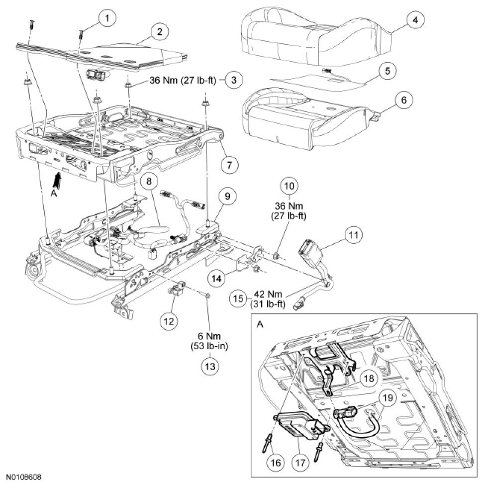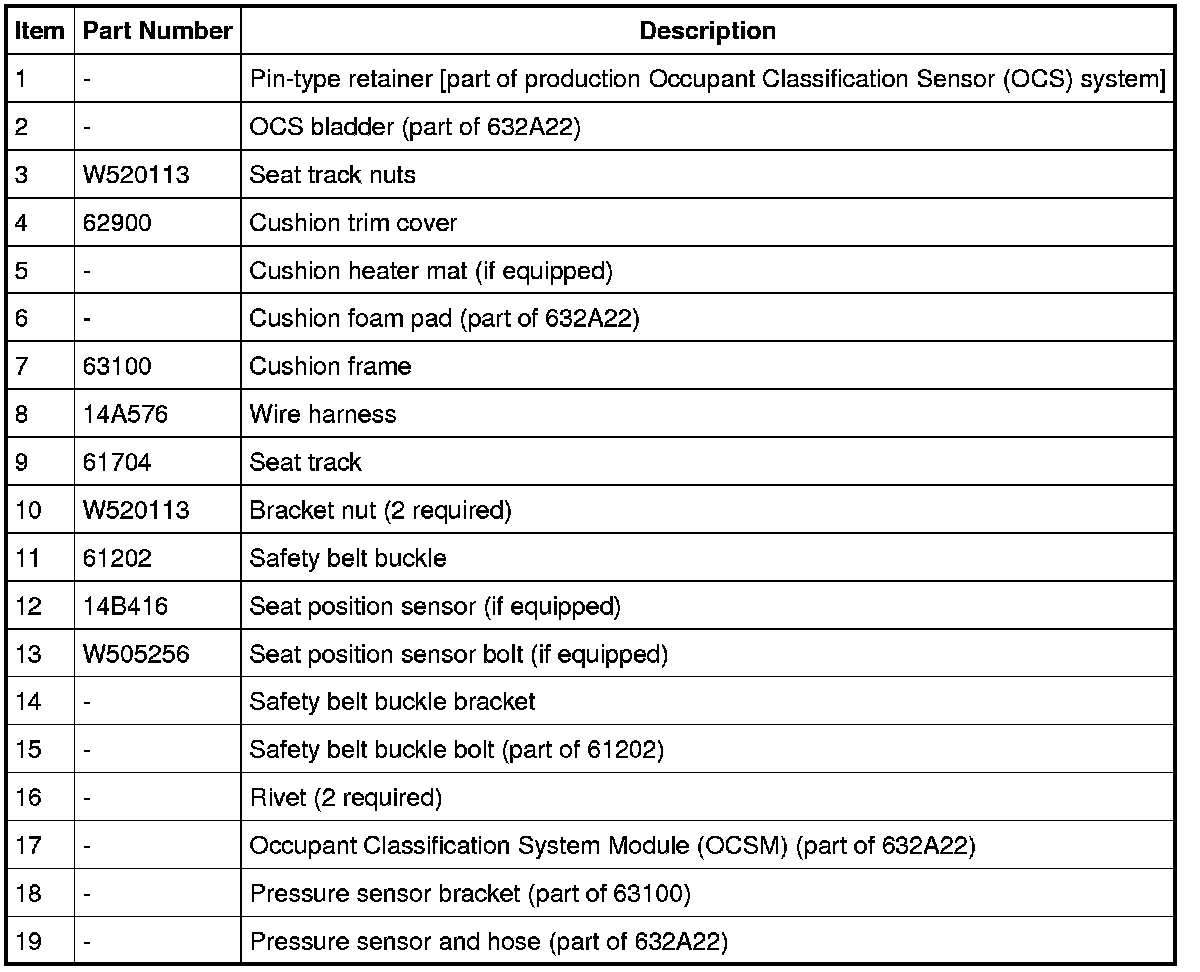 NOTE: Production Occupant Classification Sensor (OCS) system is shown. For OCS system service kit, refer to Occupant Classification Sensor procedure in Restraint Systems.