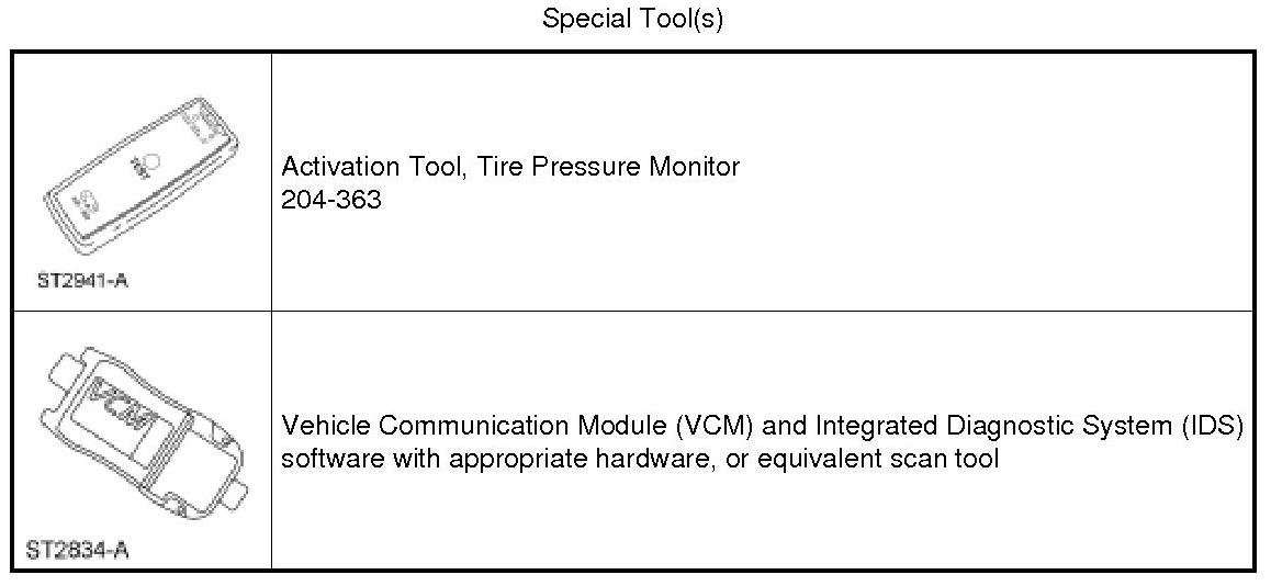 NOTE: If the vehicle has been stationary for more than 30 minutes, the sensors will go into a "sleep mode" to conserve battery power. It will be necessary to wake them up so they will transmit the latest tire pressure information to the Smart Junction Box (SJB). For additional information, refer to Tire Pressure Monitoring System (TPMS) Sensor Activation Tire Pressure Monitoring System (TPMS) Sensor Activation.