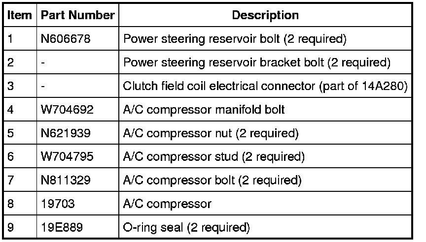 NOTE: A new A/C compressor may come equipped with an A/C clutch disc and hub, A/C compressor pulley and A/C clutch field coil already installed. If these components are not pre-installed, it will be necessary to transfer these parts from the old A/C compressor to the new compressor prior to installations of the A/C compressor if suitable for reuse.