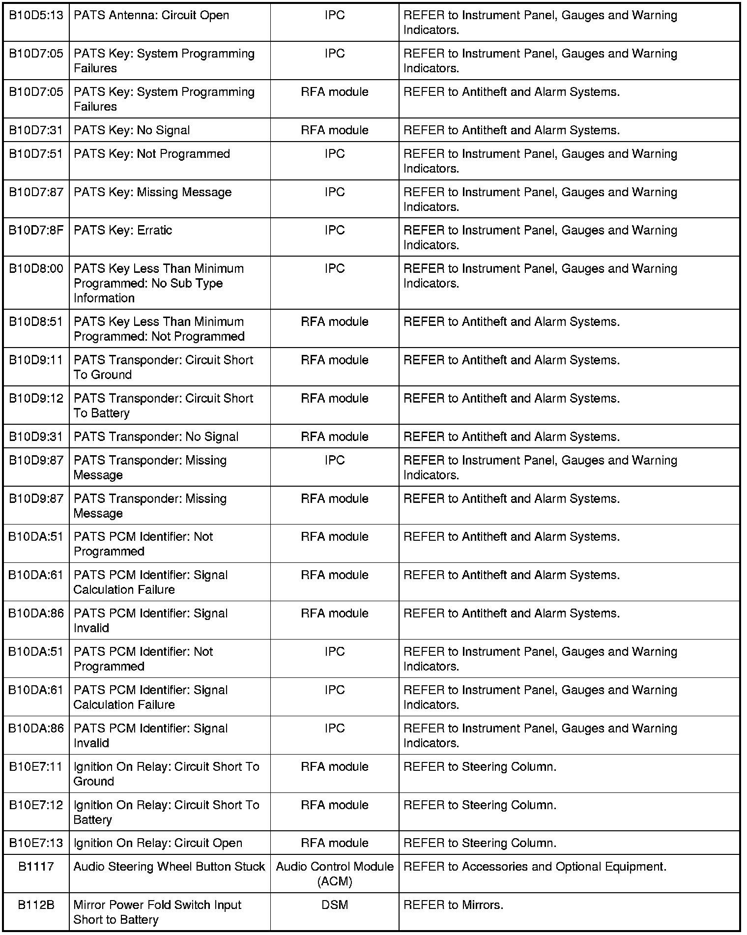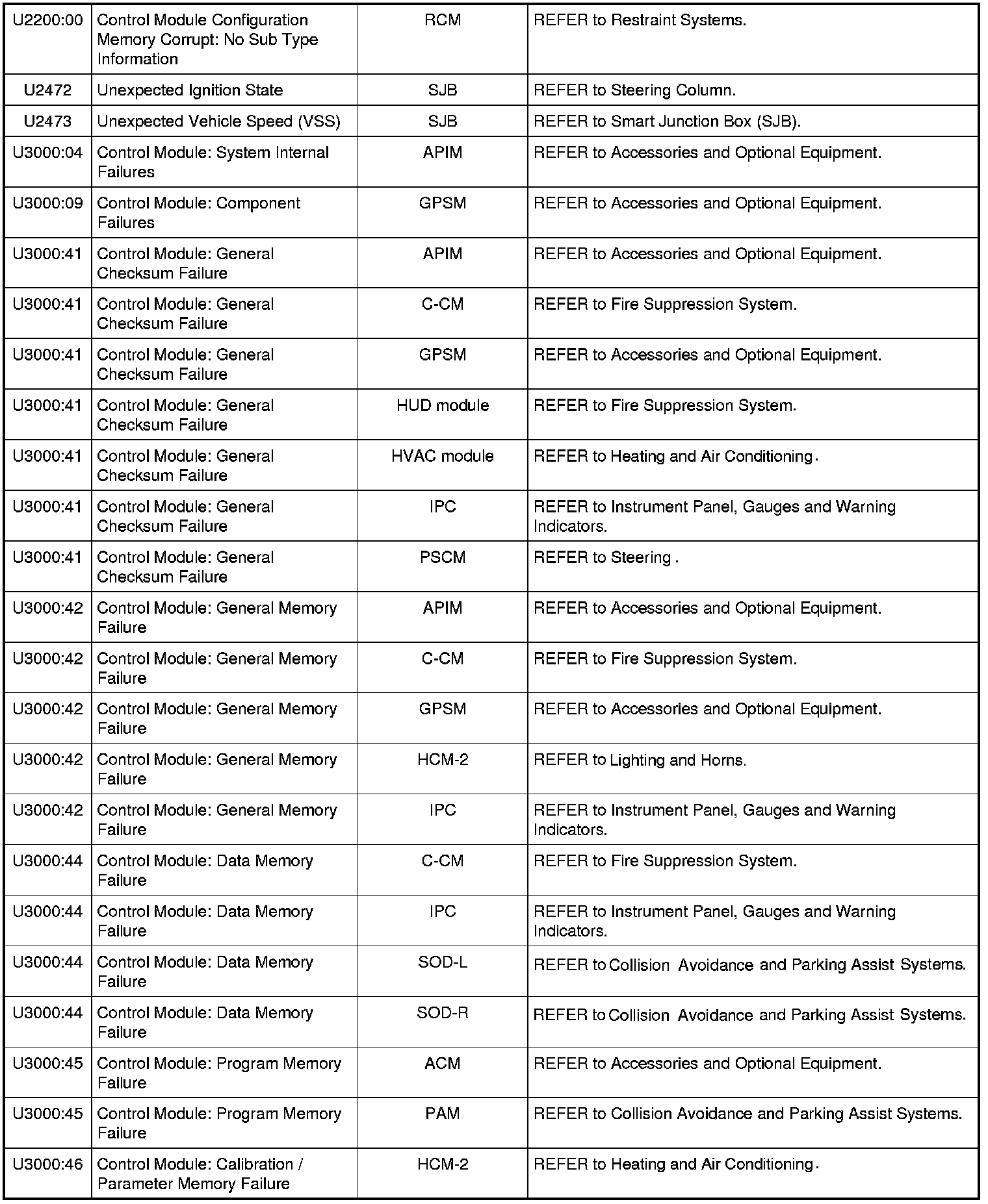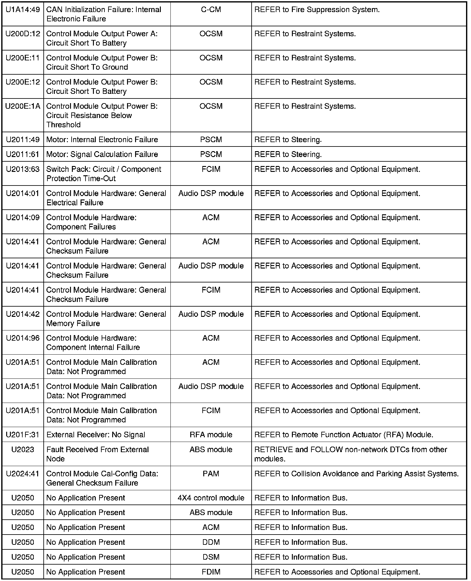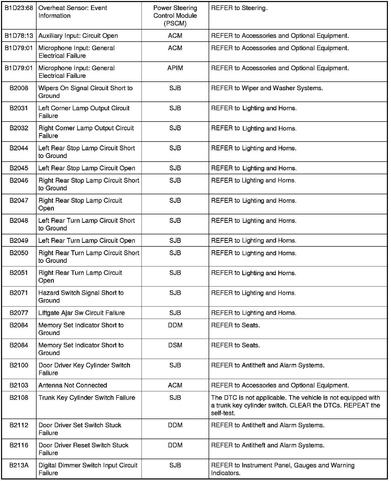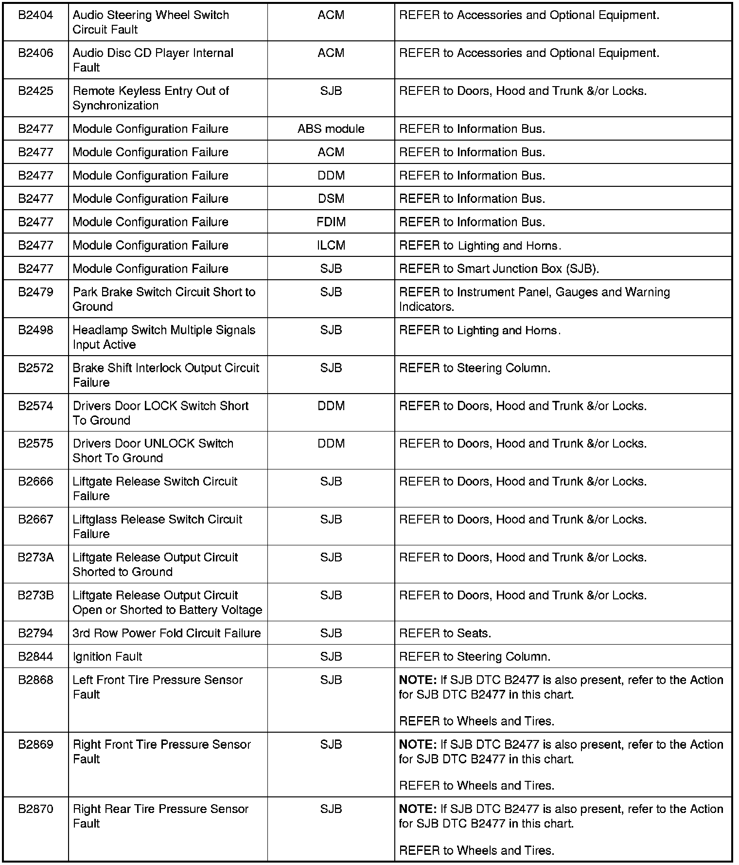 Home >> Ford >> 2010 >> Taurus AWD V6-3.5L >> Repair and Diagnosis >> Body and Frame >> Body Control Systems >> Testing and Inspection >> Diagnostic Trouble Code Descriptions >> Diagnostic Trouble Code (DTC) Chart