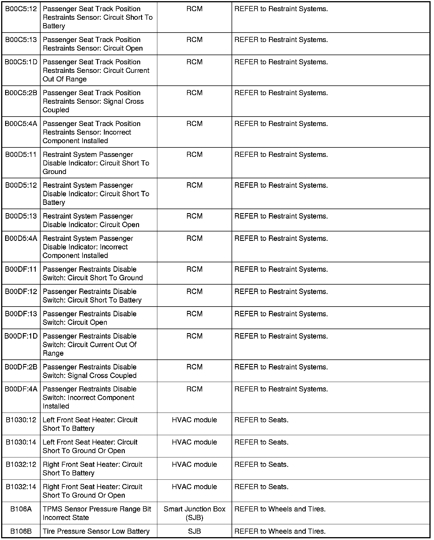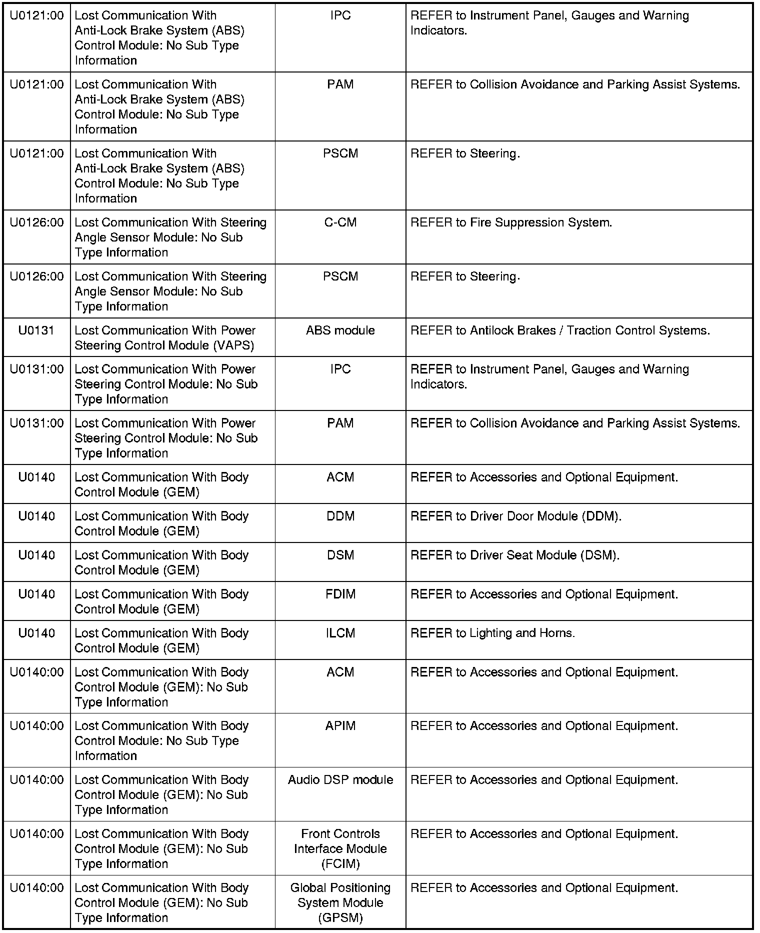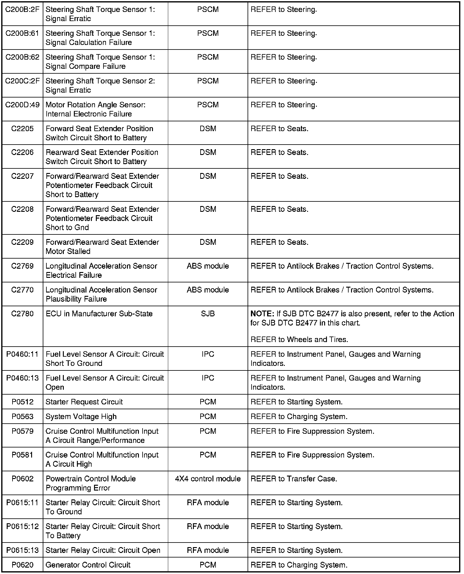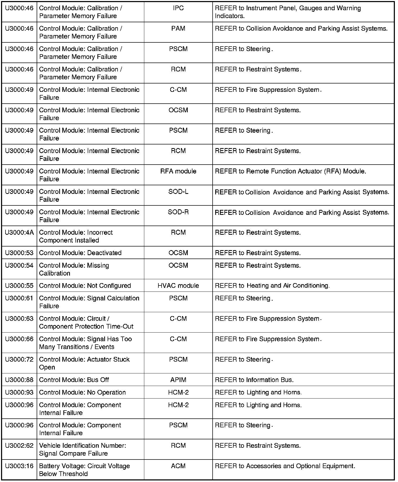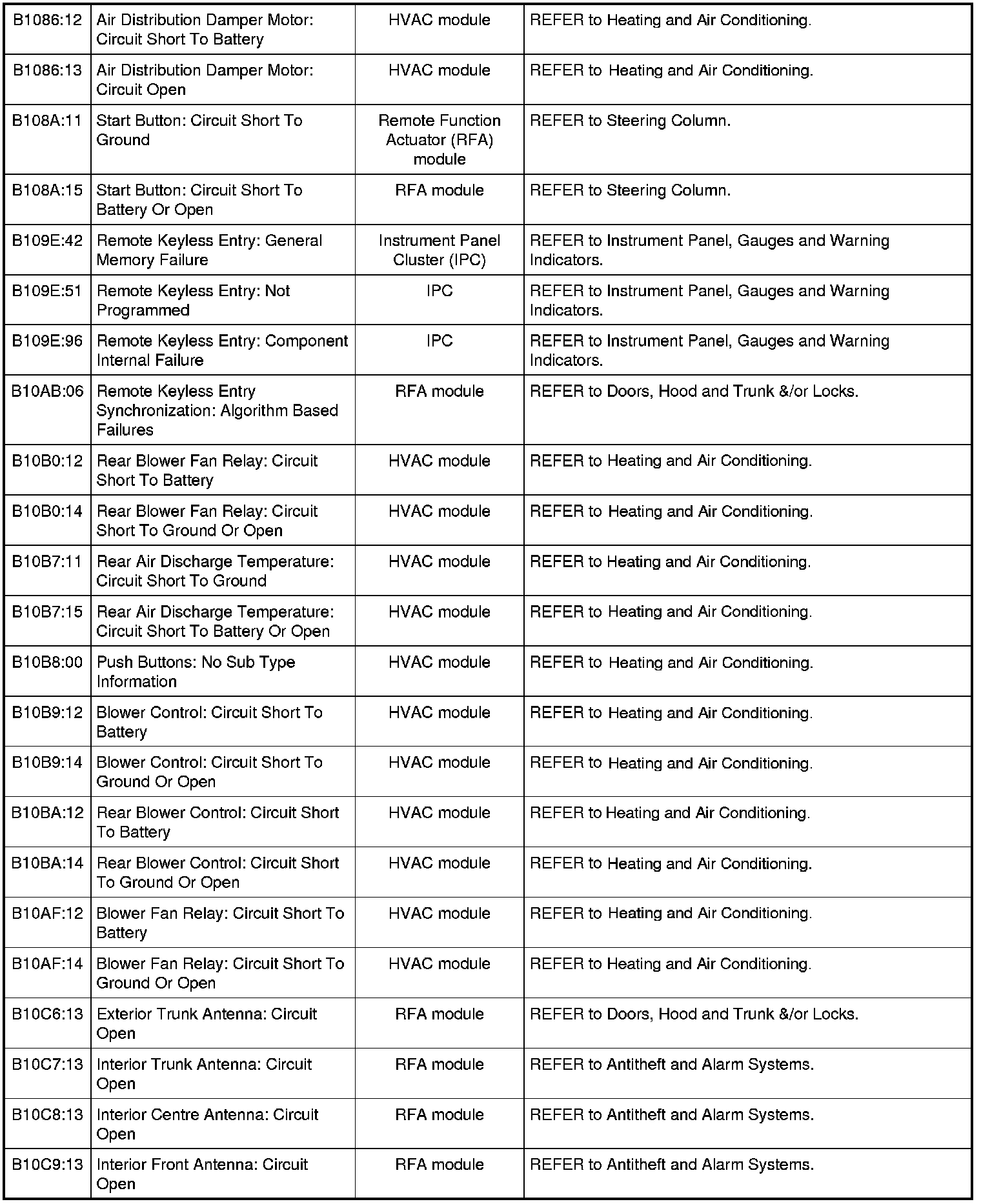 Home >> Ford >> 2010 >> Taurus AWD V6-3.5L >> Repair and Diagnosis >> Body and Frame >> Body Control Systems >> Testing and Inspection >> Diagnostic Trouble Code Descriptions >> Diagnostic Trouble Code (DTC) Chart