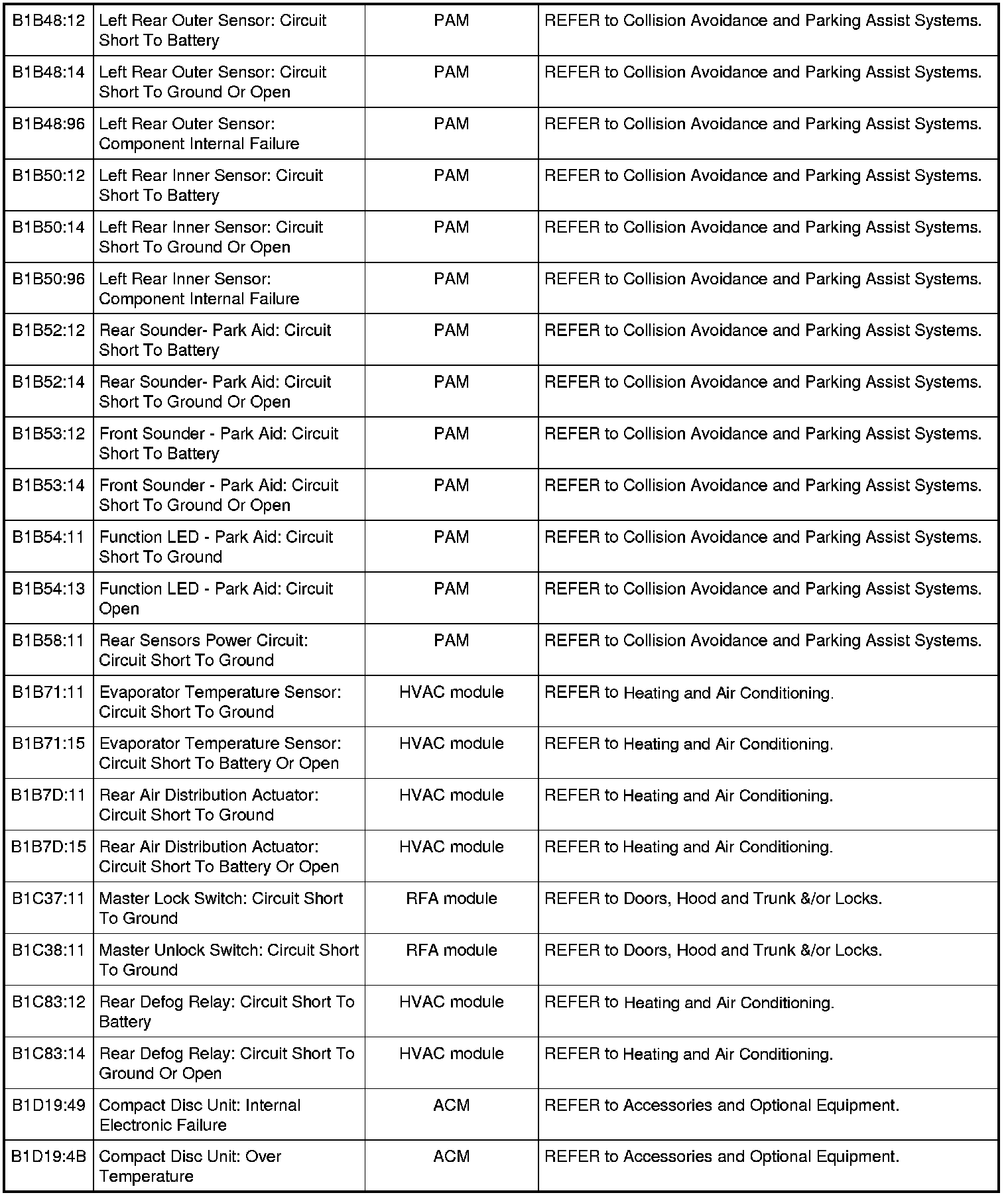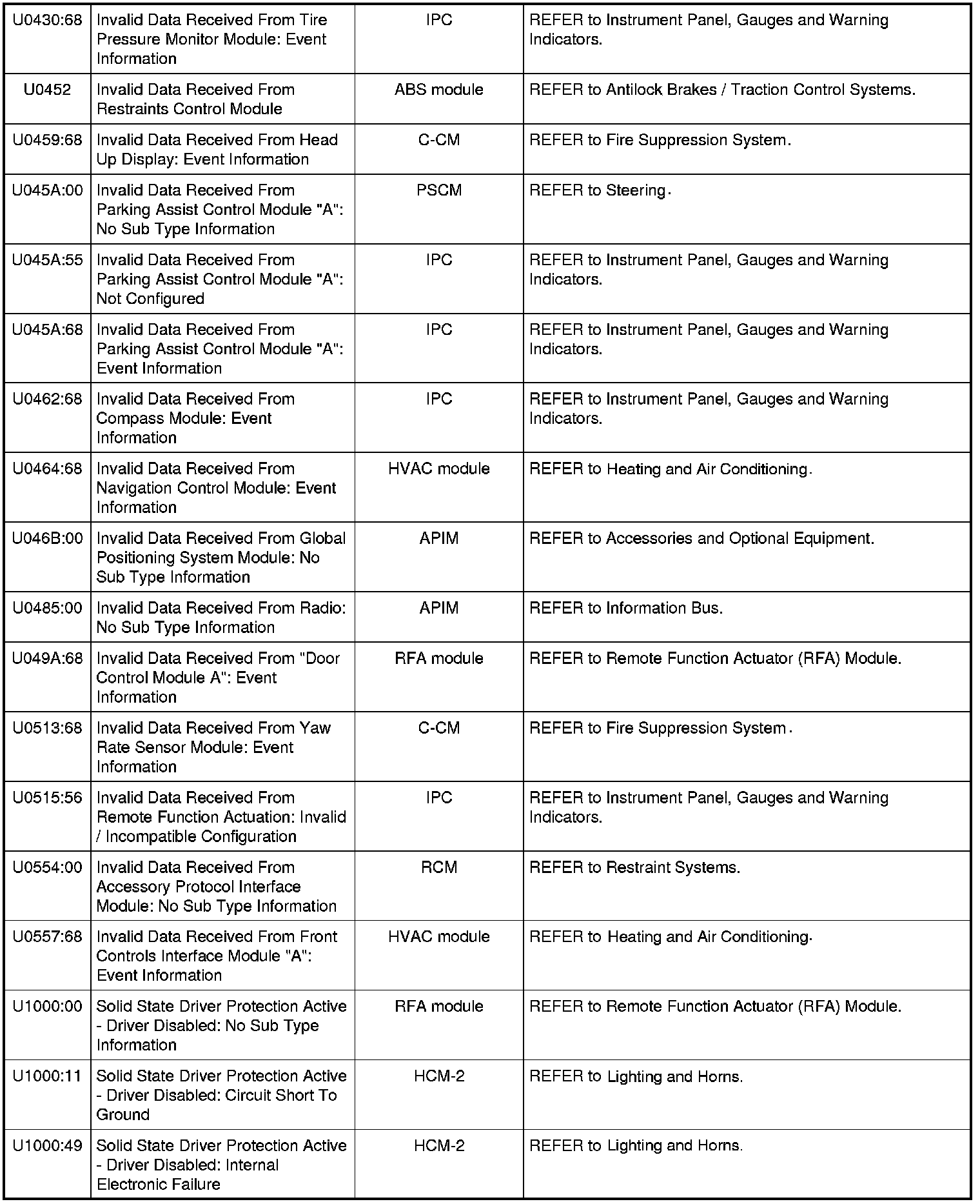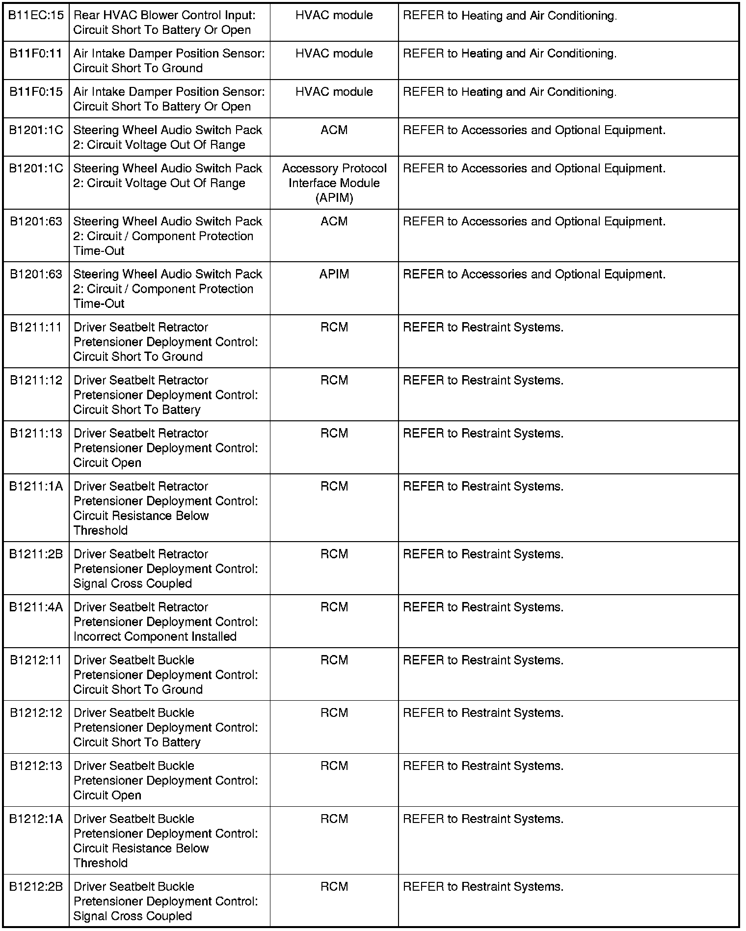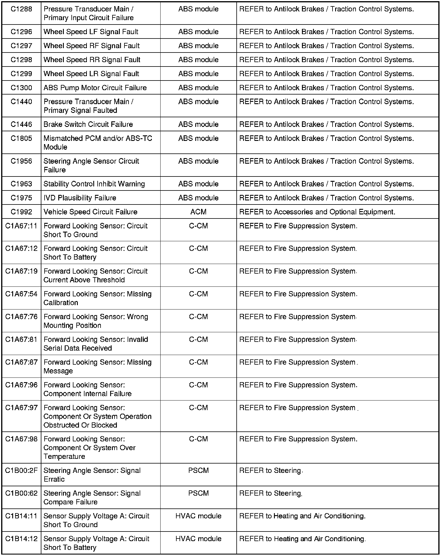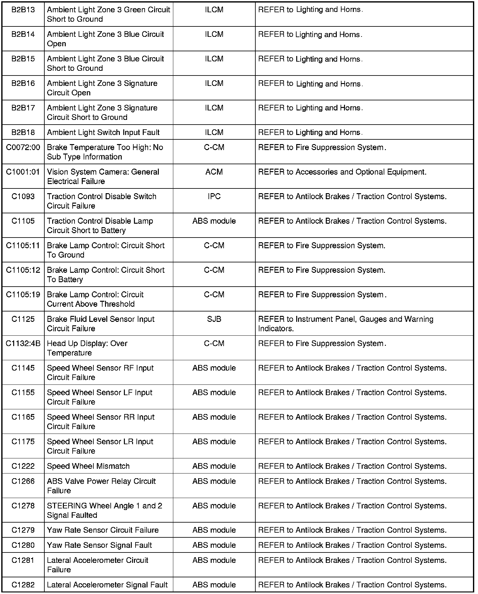 Home >> Ford >> 2010 >> Taurus AWD V6-3.5L >> Repair and Diagnosis >> Body and Frame >> Body Control Systems >> Testing and Inspection >> Diagnostic Trouble Code Descriptions >> Diagnostic Trouble Code (DTC) Chart