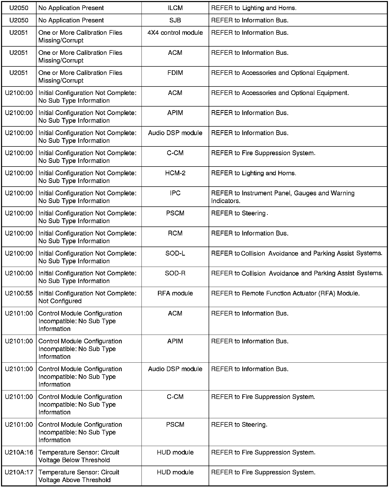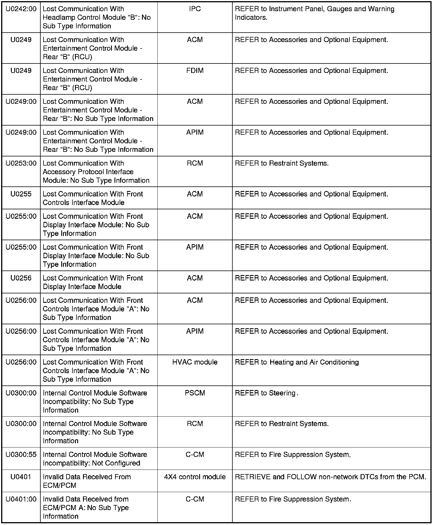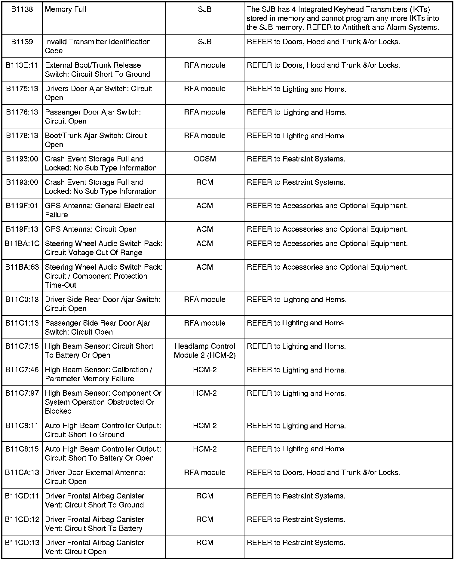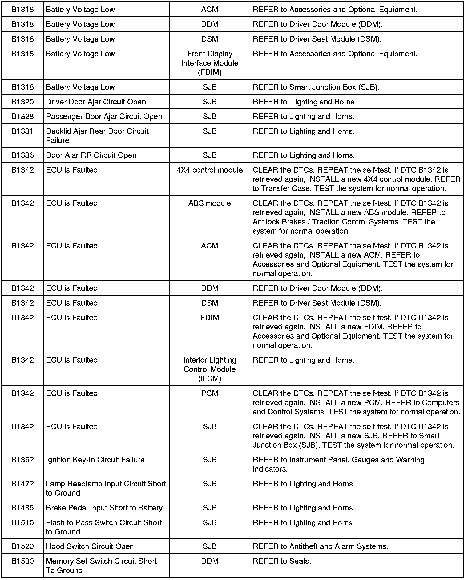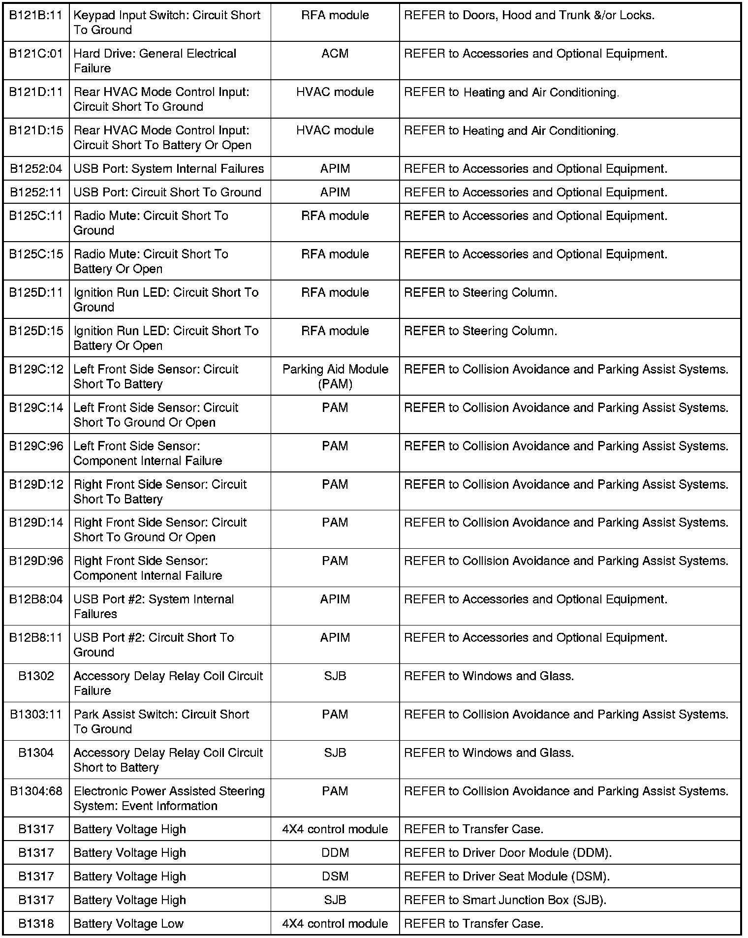 Home >> Ford >> 2010 >> Taurus AWD V6-3.5L >> Repair and Diagnosis >> Body and Frame >> Body Control Systems >> Testing and Inspection >> Diagnostic Trouble Code Descriptions >> Diagnostic Trouble Code (DTC) Chart